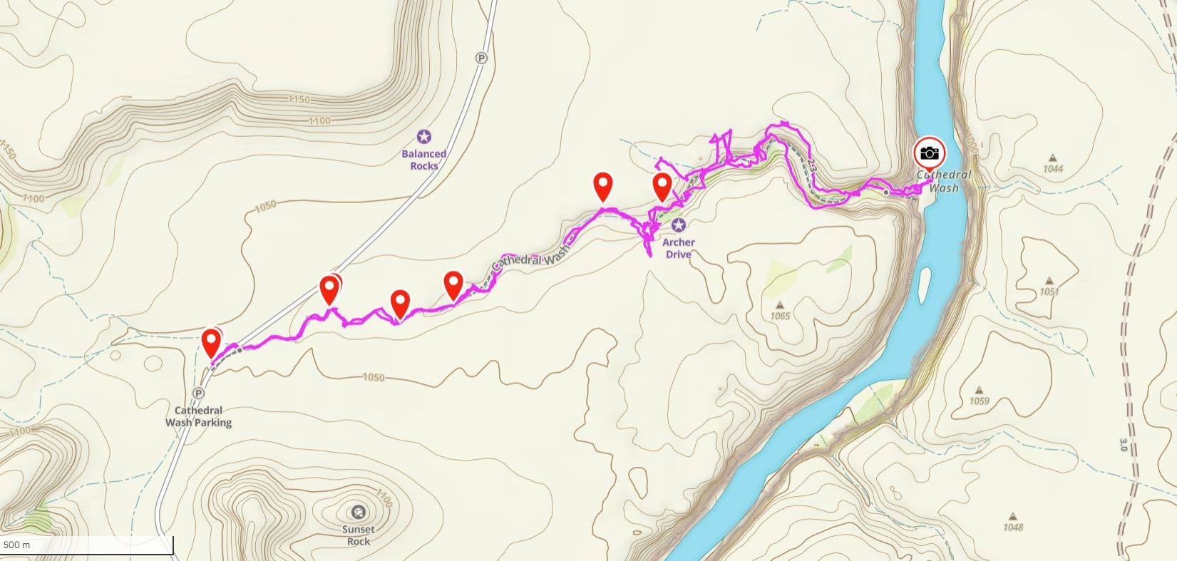 Vom Trailhead ab gibt es eigentlich keine Fragen wie der Weg geht. Der Weg den Wash entlang erklärt sich von selbst. Es gibt den Upper Cathedral Wash und den Lower Cathedral Wash. Wir wollten zum Colorado, also gingen wir den Lower Cathedral Wash. Ob der Upper sich auch lohnt kann ich nicht sagen, weil nicht begangen. |
