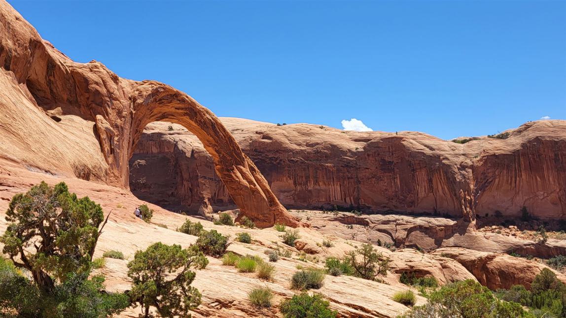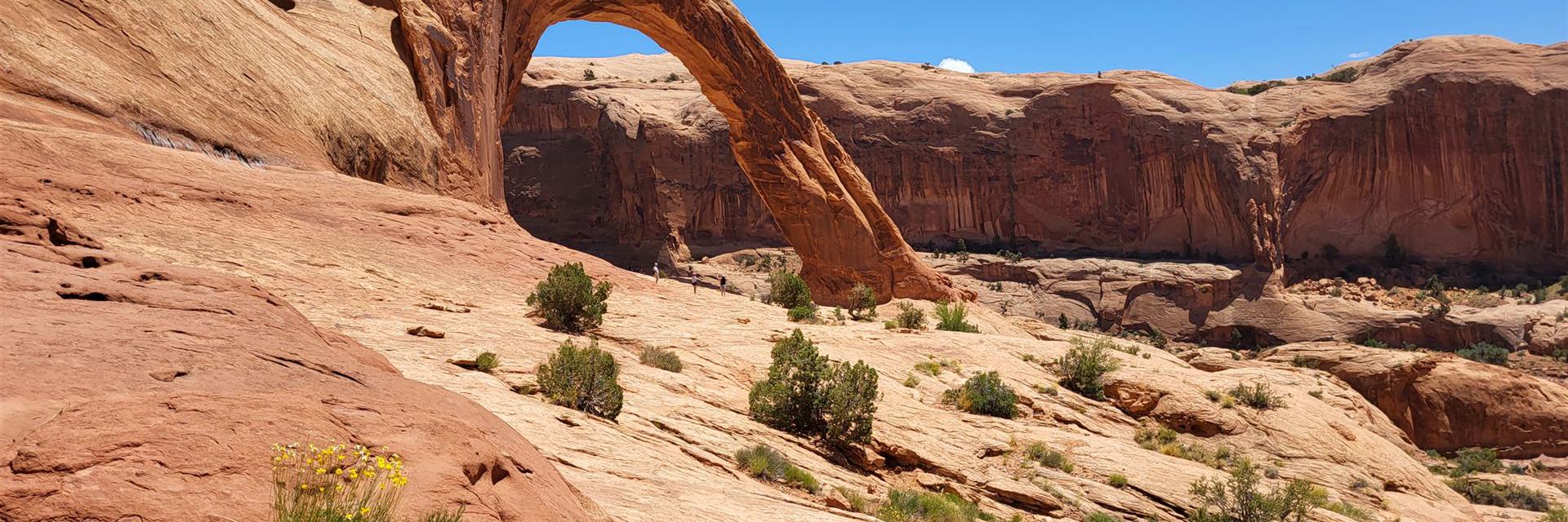 Vom Trailhead geht es erst einmal nach oben, aber nur kurz. Dann über die Bahngleise hinüber und an einer alten Jeep-Strecke entlang wieder weiter nach oben. Bald hat man die erste Höhe erreicht und es geht weiter ins Tal hinein. An der ersten Kreuzung geht es geradeaus, hier werden wir auf dem Rückweg abbiegen und noch zum Pinto-Arch laufen. Kurz danach kommt eine kleine Kletterstelle, die aber sehr gut gesichert ist und keinerlei Probleme bereiten sollte. Man muss sie nur überwinden und dann zum Corona-Arch hinlaufen. Es wartet ein einzigartiger Arch und die Wanderung hat sich jetzt schon gelohnt. |