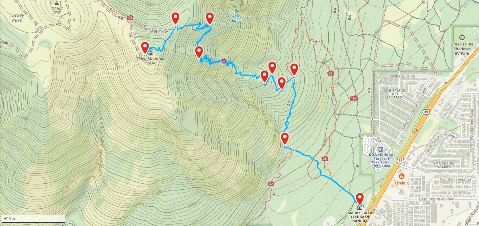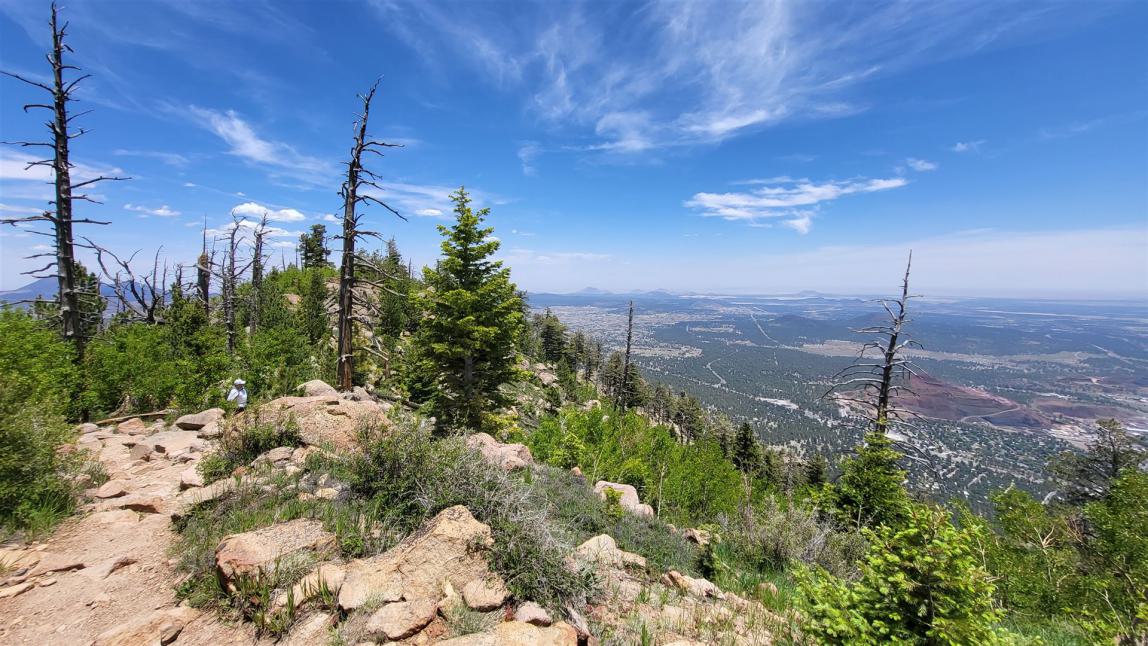 Der Lookout-Trail Trailhead beginnt noch im Stadtgebiet von Flagstaff. Bereits vom Parkplatz aus kann man die Spitze und damit das Ziel erkennen. Es geht aufwärts und es geht teilweise sehr steil aufwärts. Deswegen auch die Einordnung in mittel-schwer. Es ist keine Überwindung notwendig, aber es geht bergan und das über einen längeren Zeitabschnitt. Etwas Grundkondition ist deswegen von Vorteil. Völlig untrainiert würde ich diese Wanderung nicht angehen. |