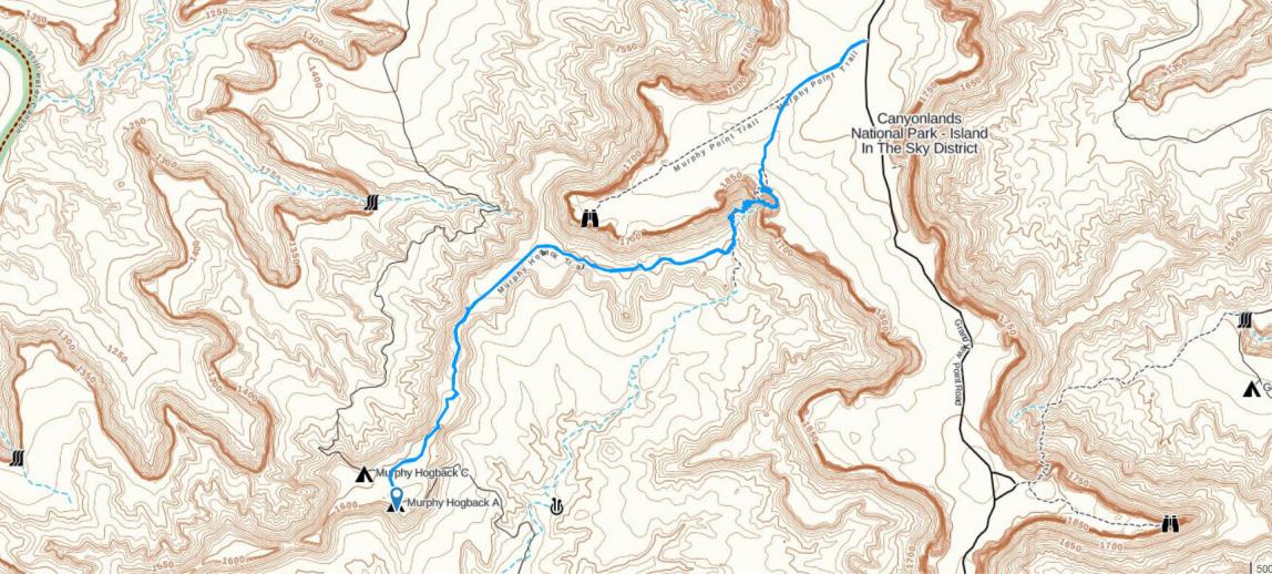 Trailhead direkt an der Straße, Weg durchgehend beschildert, zunächst auf der Hochebene entlang, an der 1. Kreuzung links ab (rechts ging es zum Outlook), dann auf engen Switchbacks direkt und schnell bergab. Unten wieder relativ eben bis zur White Rim Road. |