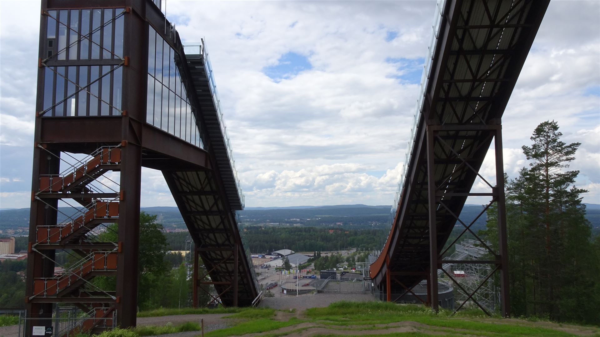 Die Berge, besser Hügel hinter den Schanzen sind durchzogen von Skilanglaufwegen. Im Winter sicher ein Traum hier Ski zu laufen. Aber auch jetzt im Sommer sind die Wanderwege gut ausgeschildert und wunderbar zu belaufen. Fast schon etwas zu gut.