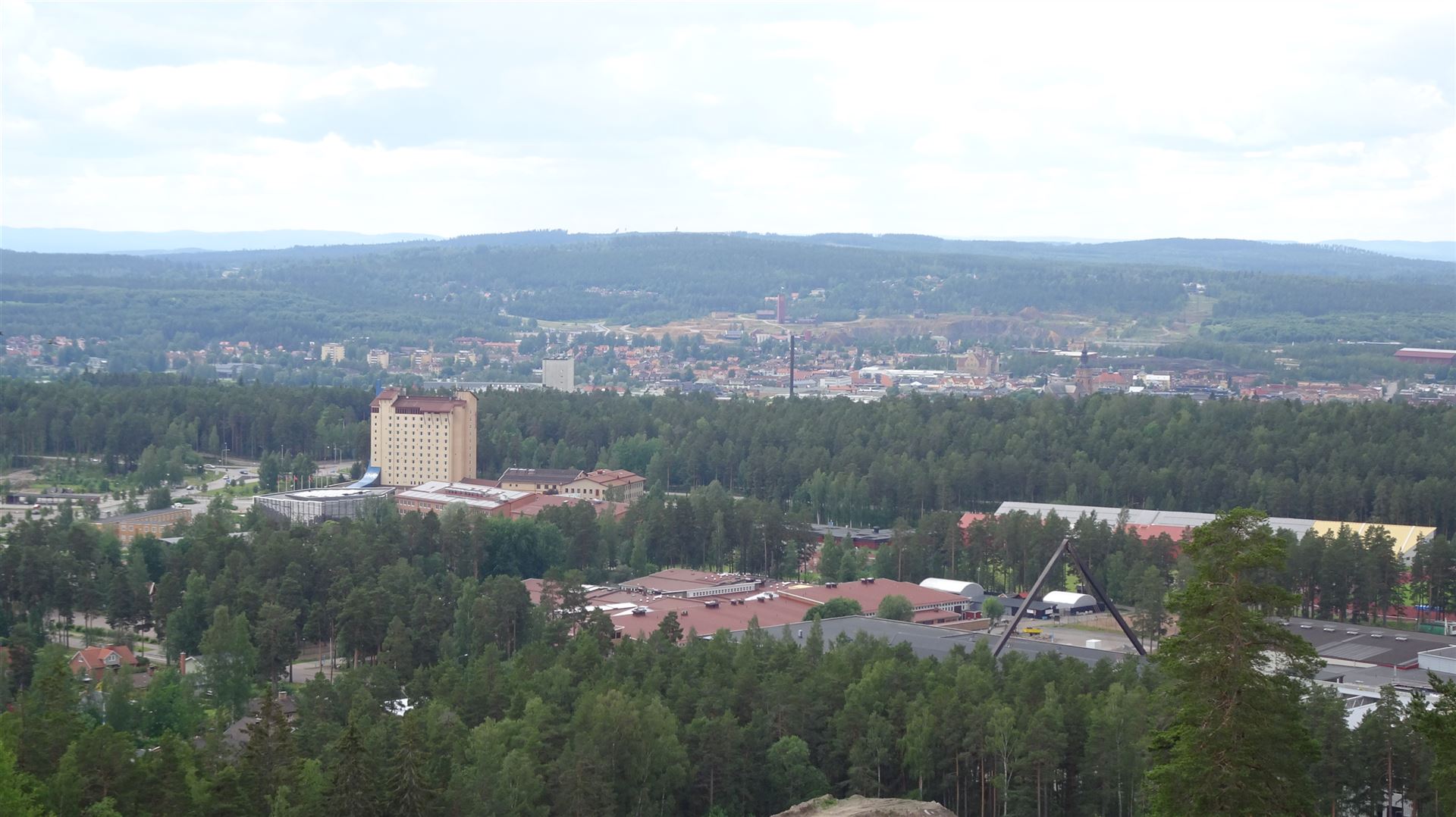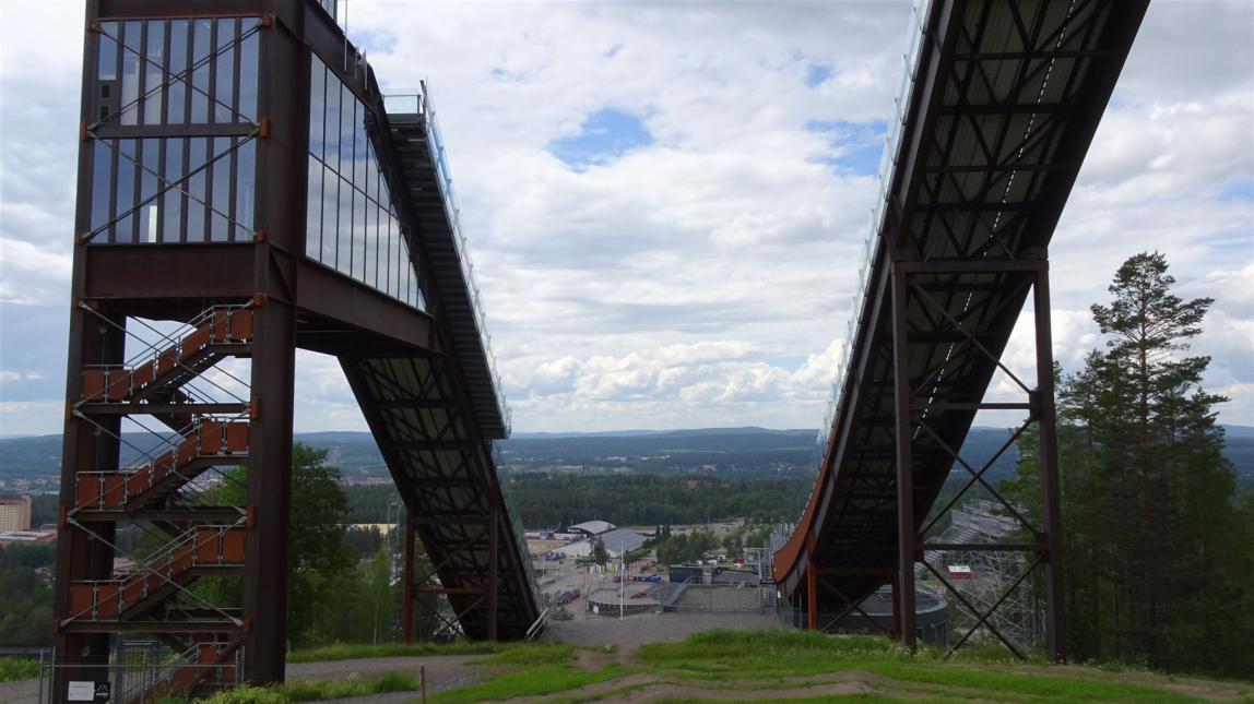 Eine kurze Besichtigung der Kupferminen stand aber für später erst an. Zunächst fuhren wir in Richtung des Sportzentrums der Stadt. Wobei Stadt vielleicht ein großes Wort ist. Falun zählt ca. 37.000 Einwohner. Immerhin. Bekannt ist Falun aber v.a als Sportstadt. Falun ist das Zentrum für nationale und internationale Wintersportwettkämpfe. So befindet sich in Falun der Sitz des Schwedischen Skiverbands sowie das Sport- und Freizeitareal Lugnet, in dem neben den Lugnet-Schanzen auch ausgedehnte Skilanglaufloipen und Abfahrtspisten liegen. Auf den Schanzen fanden bis 2002 Wettbewerbe im Skisprung-Continental-Cup und im Weltcup der Nordischen Kombination statt. Seit 2002 ist Falun jedoch nur noch Austragungsort für den FIS Cup und Skisprung-Continental-Cup sowie für Weltcuprennen im Skilanglauf.