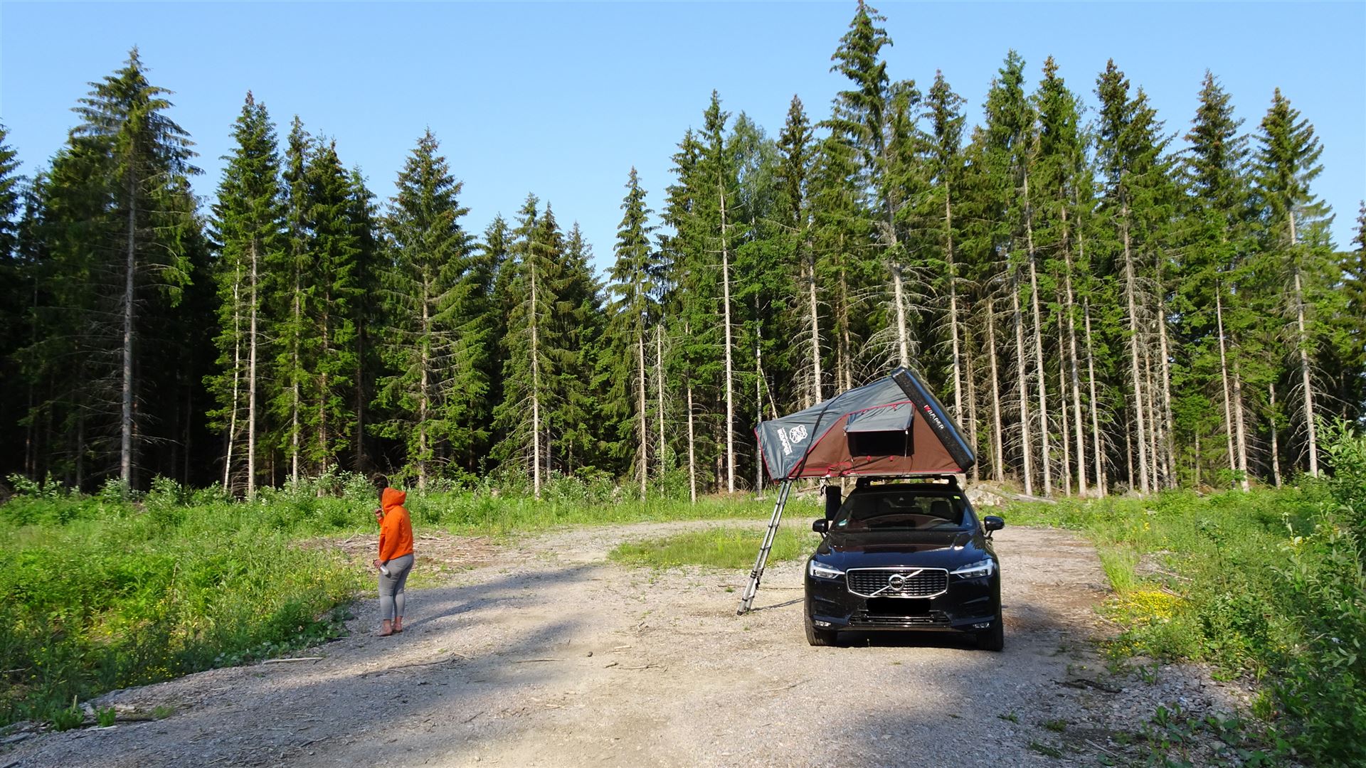 Der Platz machte vielleicht keinen absolut hervorragenden ersten Eindruck, eine nicht gerade wenig befahrene Straße direkt daneben hätte die Nacht unruhig werden lassen können. Aber das war nicht der Fall. Geholfen haben natürlich auch die rauschenden Wälder neben unserem Standplatz. Der Wind war dafür zuständig und ließ uns friedlich schlummern.