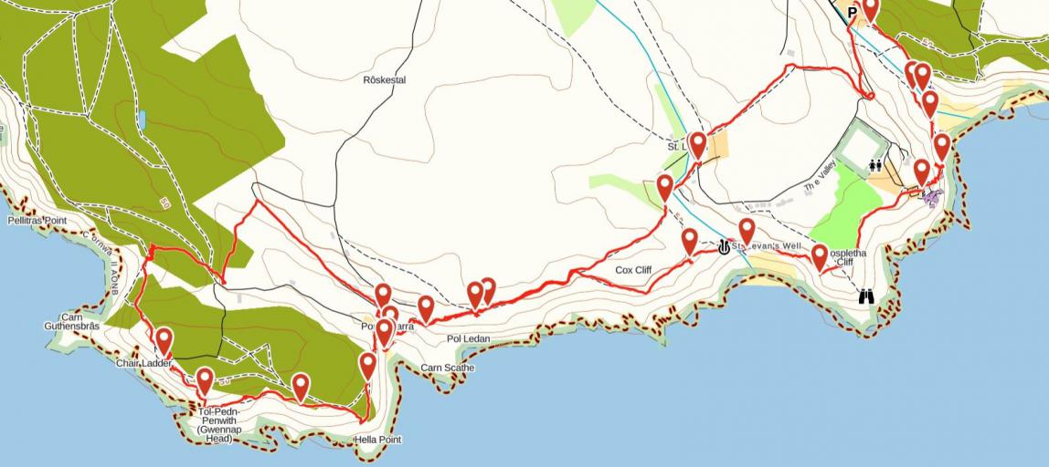Start am Car Park in Porthcurno. In Richtung Beach laufen und dort dann auf dem ausgeschilderten Trail des Southwest Coast Path entlang. |
