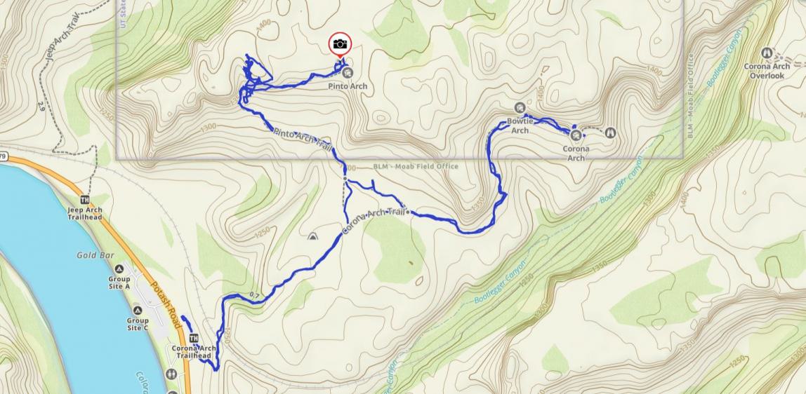 Mit einer Wanderung erlebt man 3 verschiedene Arches. Den Bowtie-Arch, den Corona-Arch und wenn man beim Rückweg noch nach rechts abbiegt auch noch den Pinto-Arch. Tolle Aussichten sind garantiert und die Wanderung ist eine der Höhenpunkte hier. Im Tal fließt der Colorado, im Hintergrund kann man die LaSal-Mountains erblicken. Es gibt kaum etwas schöneres. |