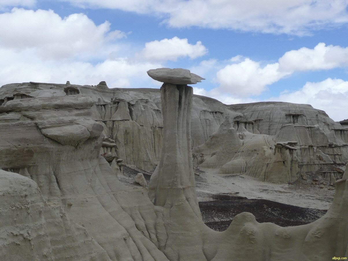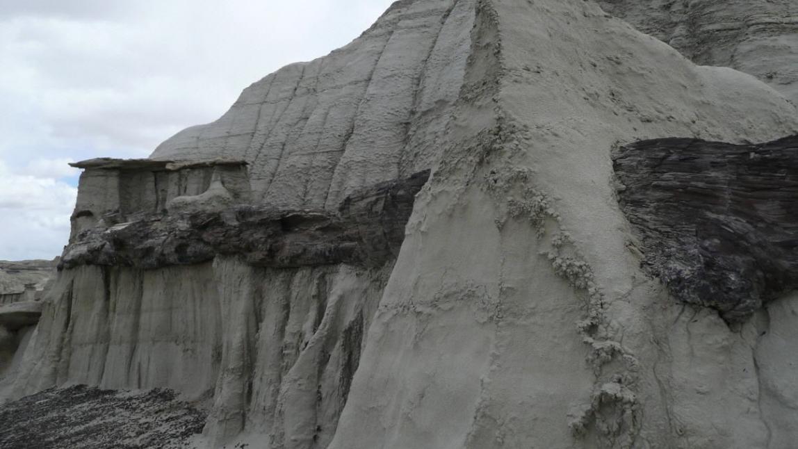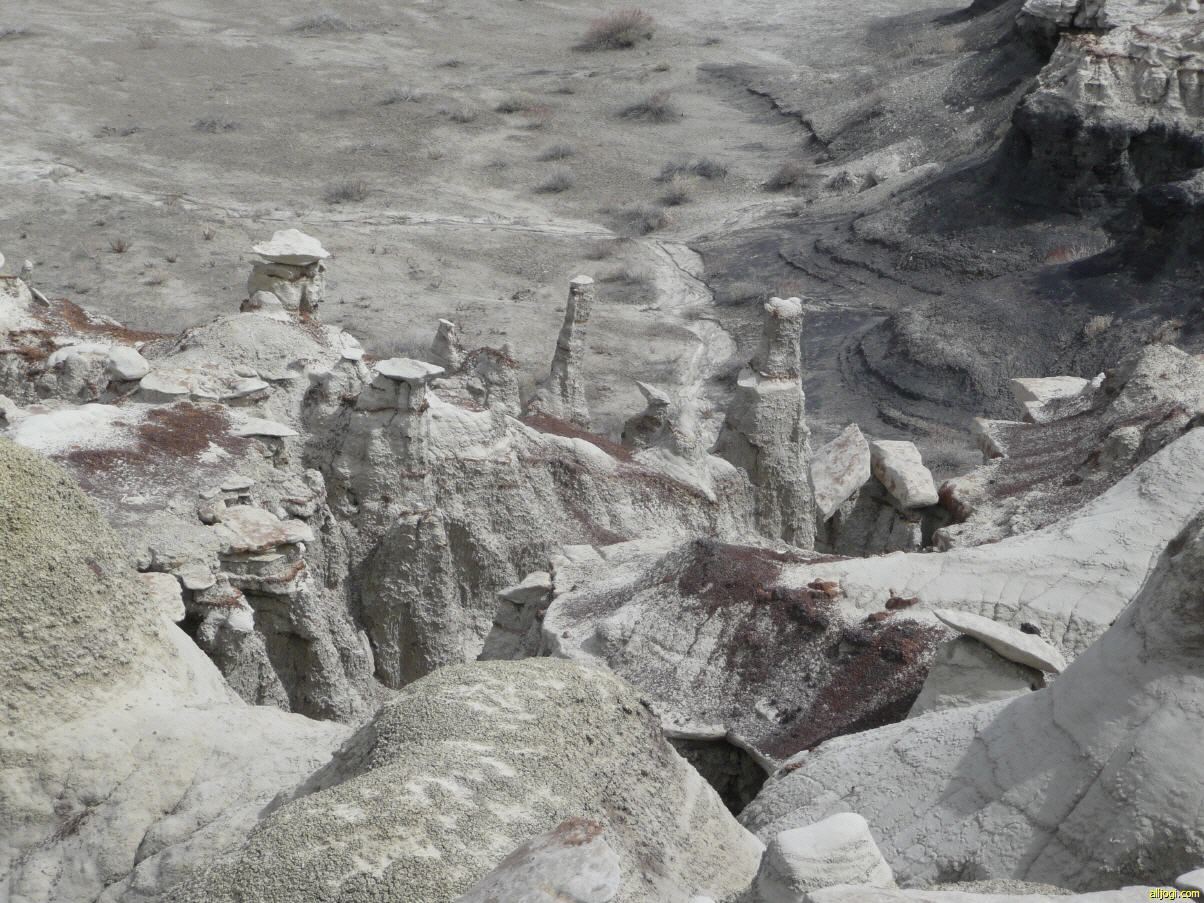 Übrigens konnten wir immer wieder solche Löcher, wie auf dem Bild unterhalb des Hoodoos erkennen. Ob diese Abbrüche gefährlich sind? Ich habe noch nie etwas davon gehört, dass Wanderer in der Bisti Wilderness im Boden verschwunden sind. Auf der anderen Seite haben wir heute Löcher gesehen mit bestimmt 7 - 8 Meter Tiefe. Wenn du da aus Versehen reinstürzt ist das auch nicht das reine Vergnügen. Ein wenig Vorsicht kann also nicht schaden, wenn man hier zwischen den Hoodoos herumwandert.
