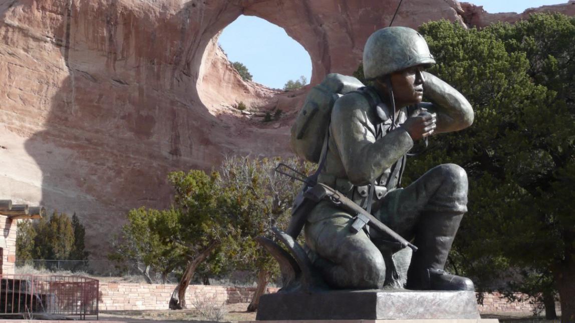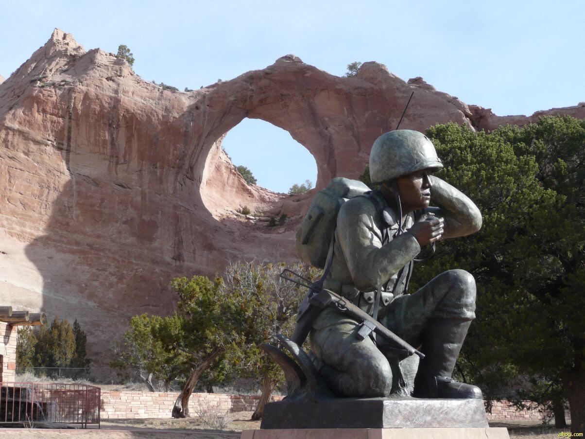 Vorne dran hat man noch den Navajo Code Talkers ein Denkmal gesetzt. Die feindlichen Japaner haben alle Codes der USA im 2. Weltkrieg geknackt. Da wusste man sich nicht mehr anders zu helfen, als die Navajos mitsamt ihrer Sprache als Code einzusetzen. Dieser Code wurde erst 1968 freigegeben, was immer freigeben in diesem Zusammenhang auch bedeutet. Wer jemals einen Navajo seine Sprache hat sprechen gehört, weiß dass dieser Code schwer knackbar ist. Selbst das Nachsprechen Wort für Wort ist fast unmöglich. Wir haben 1994 im Monument Valley einmal eine kurze Lehrstunde diesbezüglich genossen und uns wie die Deppen angestellt.