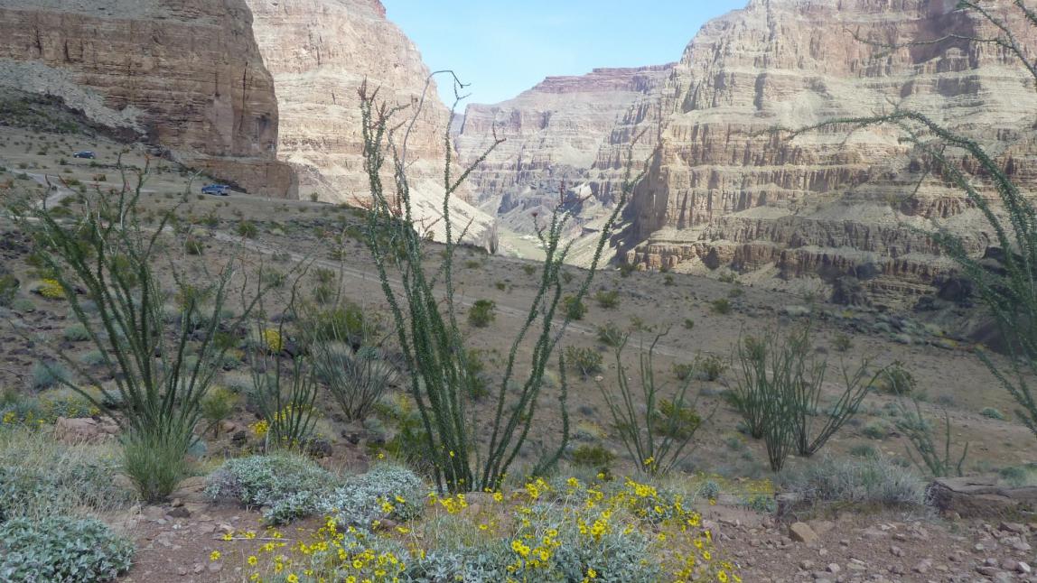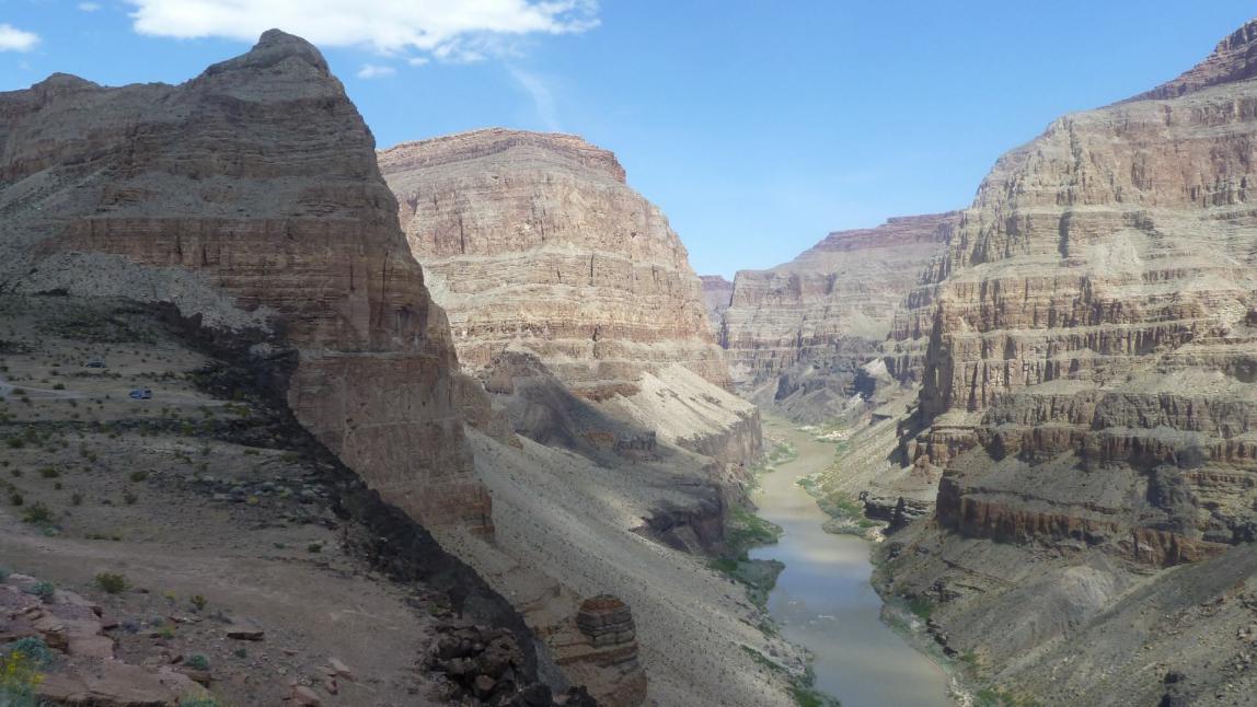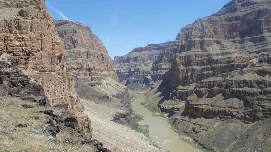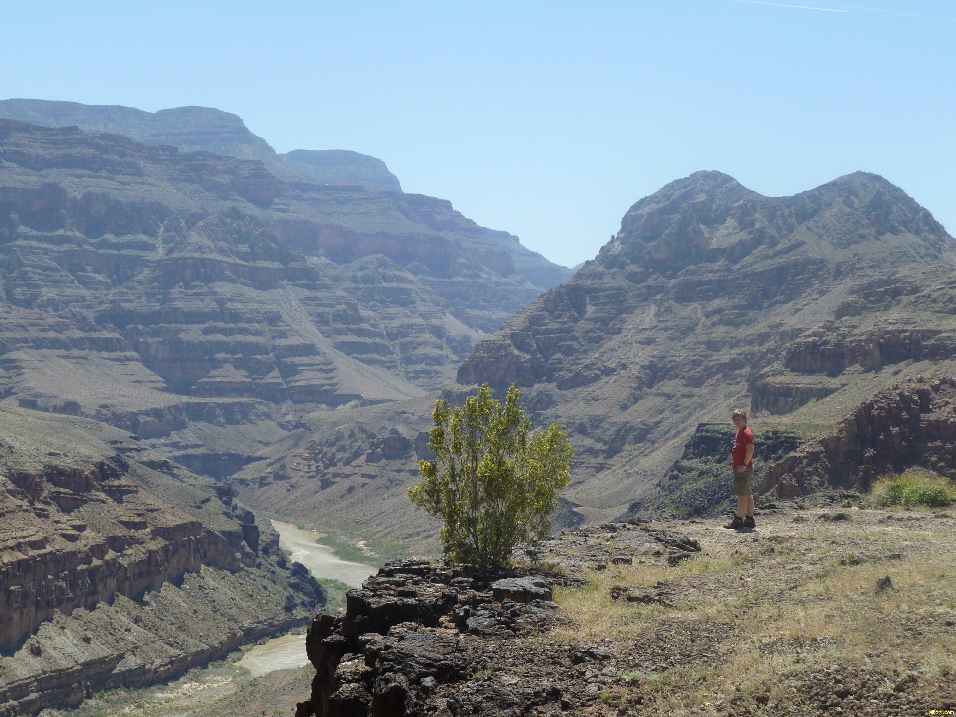 Bis zum Wasser sind es hier auch nur ca. 300 Höhenmeter, für die wir reine Gehzeit hin und zurück nur 1,5 Stunden gebraucht haben. Allerdings war der Anstieg bei Nachmittagshitze doch recht schlauchend, vor allem weil wir die Hitze nicht richtig gewohnt waren. Auf dem Weg hinunter taucht man so richtig in den Canyon ein. Über ein Lavafeld schlängelt man sich bis hinunter. Sehr beeindruckend diese Wanderung. Hier entstand übrigens vor ca. 180 Tausend Jahren, nach einem Vulkanausbruch, ein natürlicher Staudamm aus erkalteter Lava. Der Colorado brauchte dann geschlagenen 20 tausend Jahre um in langwierigen Verhandlungen den Durchbruch zu schaffen. Übrig blieben die Whitmore Falls, das sind ein paar Stromschnellen die die Bootsfahrer hier aber nicht vor zu großen Aufgaben stellen.