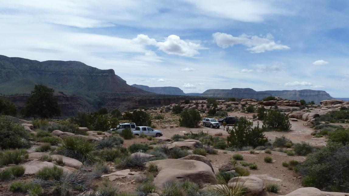 Leider war die Anfahrt so wie ich es mir vorgestellt hatte. Auch hier sei an das Preview und an den dortigen Link erinnert. Wir waren vorbereitet. Aber auf das was uns dann tatsächlich vor Ort erwartete, waren wir es dann irgendwie auch wieder nicht. Man kam nur im Schritttempo vorwärts. Zumindest wenn man wie wir nur normale Straßenreifen auf seinem SUV aufgezogen hat. Von der Bar 10-Ranch bis zum Endpunkt der Route brauchten wir geschlagene 2 Stunden für sage und schreibe 10 Meilen. Natürlich hätte man auch schneller fahren können, aber die Gefahr sich einen Platten zu holen war mir einfach zu groß. Deswegen ließen wir es gemächlich angehen. Das hatte allerdings zur Folge, es heute auf keinen Fall mehr bis zum Toroweap Point, unserem eigentlichen Übernachtungsziel, zu schaffen und so schlugen wir unser Nachtquartier direkt hier am Overlook auf. Ich kann nur sagen: "Wahnsinn!!!".