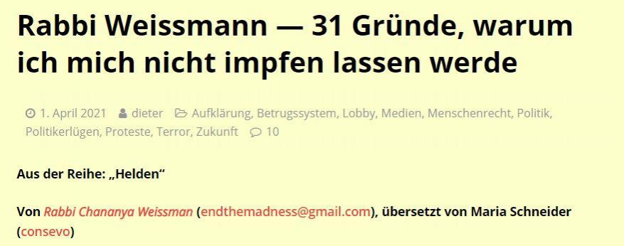 Weil man die Kritiker der aktuellen Regierungskurse gerne in die antisemitische Ecke stellt, ich denke Rabbi Weissmann ist davor gefeit. Er hat 31 Gründe gefunden, warum er sich nicht impfen lassen will. Vielleicht ist ja der ein oder andere für euch dabei. Es kann aber auch sein, dass ihr euch die 31 Gründe durchlest und dann sagt, ich sehe das ganz anders und lasse mich deshalb impfen. Das wäre dann ja auch OK, weil das Impfen sollte eine persönliche Angelegenheit sein und ich würde niemals jemand verurteilen der sich impfen lassen. Jeder hat seine Gründe und die soll er auch vertreten dürfen. Das nennt man übrigens Demokratie. Wenn dann allerdings der Staat kommt und sagt, ihr müsst euch nicht impfen lassen, aber wenn ihr es nicht tut dann dürft ihr halt nicht mehr reisen, essen gehen, ins Kino gehen, einkaufen usw. Das nennt man dann nicht mehr Demokratie, sondern Diktatur. Das aber nur nebenbei.