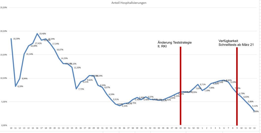 Was ihr hier seht ist eine Grafik aus den offiziellen Zahlen des RKI gebastelt. Die Grafik zeigt den prozentualen Anteil der Testpositiven an der Gesamtzahl der PCR-Tests. Die Schnelltests werden bei dieser Gesamtzahl nicht mitgezählt und insofern steigt natürlich nach Einführung der Schnelltests auch der prozentuale Anteil, weil ist der Schnelltest negativ wird das niemand über einen PCR-Test nachprüfen. Jedoch umgekehrt natürlich schon. Das das RKI jetzt mit dem prozentualen Anstieg auch eine erhöhte Infektiosität innerhalb der Bevölkerung sehen will, ist blanker Unsinn. Aber das ist ja vieles was im Moment vom RKI kommt.