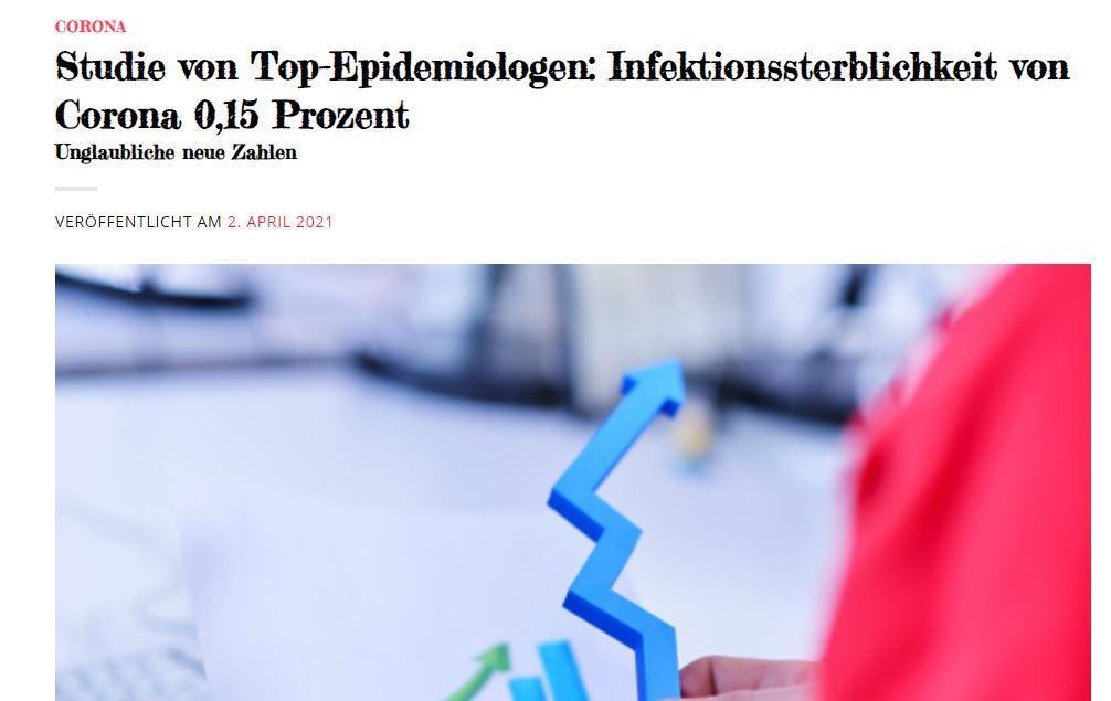 Fazit von Ioannidis‘ Auswertung ist, dass die Infektionssterblichkeit von Corona global bei rund 0,15 % liegt. Überträgt man diese Zahl auf Deutschland, was insofern möglich erscheint, da Ioannidis‘ Datenmaterial zum überwiegenden Teil aus Europa und Amerika stammt, ergibt sich Folgendes: In Deutschland stirbt jede 667. Person, die sich mit SARS-CoV-2 infiziert. Nimmt man dagegen nicht die Infektionssterblichkeit, sondern die Fallsterblichkeit (Stand RKI 30.03.2021), ergibt es ein völlig anderes Bild: In Deutschland stirbt jede 37. Person, die sich mit SARS-CoV-2 infiziert.