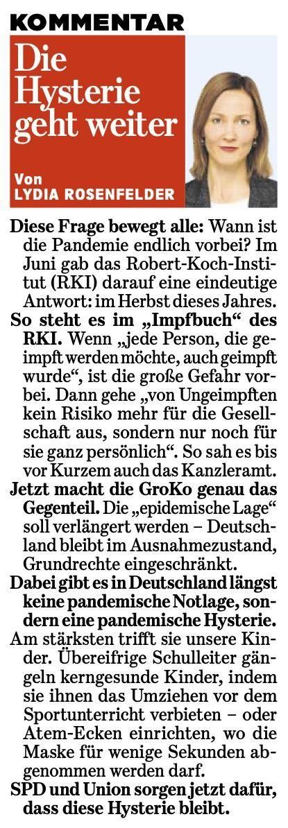 Die Bild in Person von Lydia Rosenfelder fragt sich das auch in ihrem Kommentar. Im Impfbuch des RKI steht sinngemäß: Die Pandemie ist dann vorbei, wenn alle die geimpft werden möchten, auch geimpft worden sind. Punkt. Mehr muss man glaube ich nicht sagen. Die Regierenden haben Spaß daran gefunden ihre Bevölkerung unter der Fuchtel zu halten und werden ohne Gegendruck von der Straße oder über Wahlen, am besten beides, diese Macht nicht mehr hergeben.