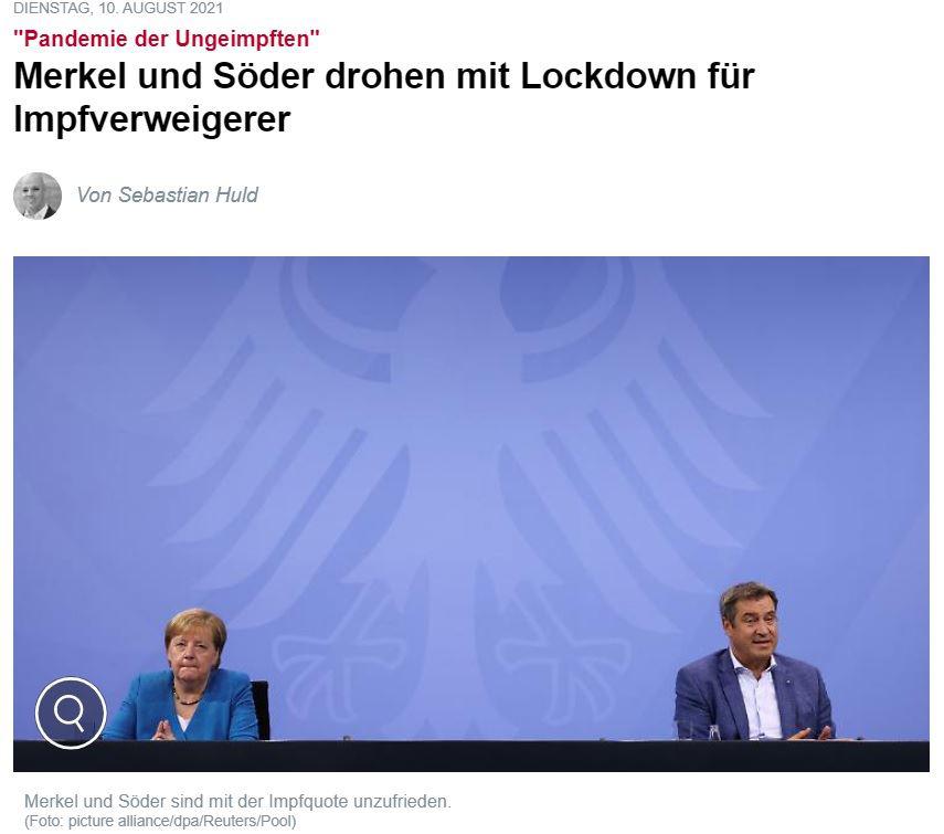 Der Hammer! Die Ungeimpften wurden, in der Tagesschau vom 10.08.2021 nebenbei darauf konditioniert und vorbereitet, dass sie bald dauerhaft eingesperrt werden oder sich impfen lassen müssen! Spahn und die 2G-Regel! Dann verlieren sie auch die Arbeit, die Wohnung und werden verhungern, wenn sie kein Geld mehr haben. Vermutlich bekommen sie auch nur noch dann Sozialleistungen, wenn sie sich impfen lassen! Die Impfpflicht ist längst da! Alle Politiker haben wie immer gelogen!