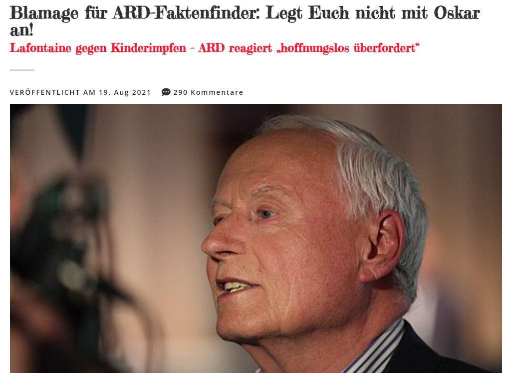 Auch Oskar Lafontaine hat sich zu Impfungen und hier v.a. zu Kinderimpfungen geäußert. Das hat wiederum den ARD-Faktenfinder auf den Plan gerufen. Dummerweise hat man aber die vorgelegten Studien und Fakten eines Oskar Lafontaines nicht abmildern können, sondern hat versucht ihn grundsätzlich ins Lächerliche und auf das Altenteil zu ziehen. Darüber gibt es einen schönen Artikel von reitschuster.de: