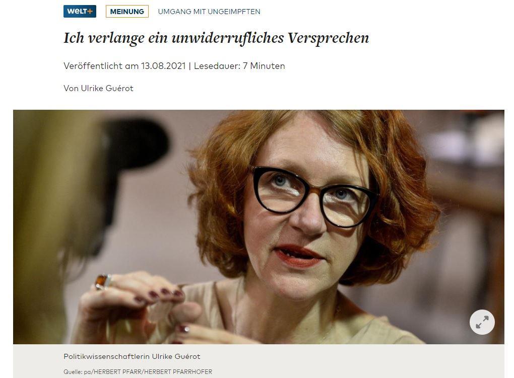 Ulrike Guerot analysiert in einem Weltbeitrag gewohnt scharfsinnig und klug das Handeln der politischen Entscheidungsträger. Es ist, als hätten sie den seit nunmehr 18 Monate anhaltenden Notstand auf eine für einen freiheitlich-demokratisch denkenden Menschen abstoßende Weise nahezu liebgewonnen. Anders lässt sich mE das fast schon neurotische Festhalten an Alarm, Warnung und autoritären Maßnahmen nicht mehr erklären. Dass es der inneren Logik des Systems der maximalen Sicherheit grob und offensichtlich widerspricht, Geimpfte von der Testpflicht auszunehmen, ist dabei nur eine schwer zu ertragende Inkonsitenz.