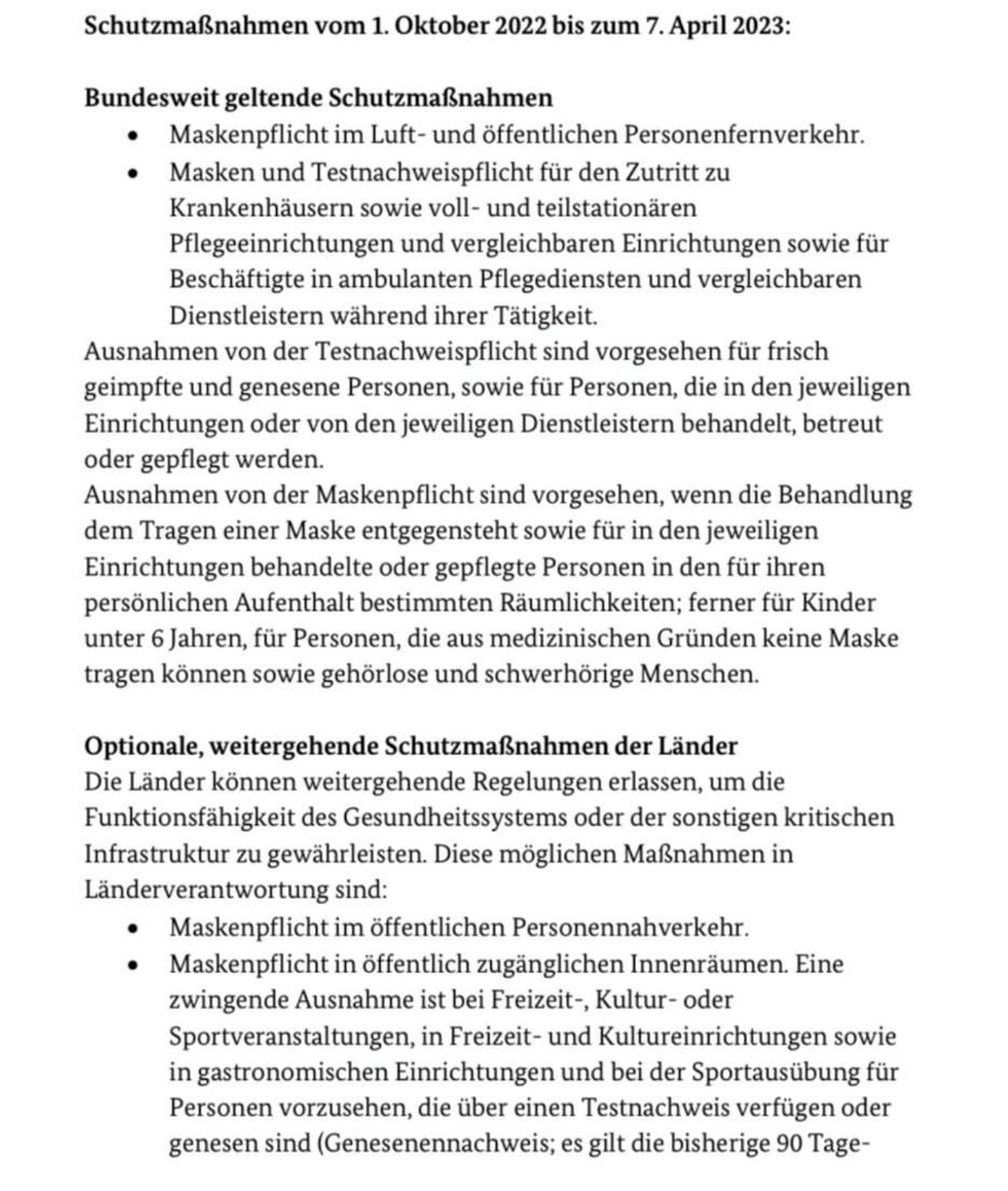 Man macht wieder 5 Schritte zurück. Hatten wir die Maßnahmen weitestgehend ab April 22 hinter uns gelassen bis auf die unsägliche Maskenpflicht im öffentlichen Verkehr und der unglaublichen Impfpflicht bei Gesundheitsberufen, so soll ab dem Oktober die Maskenpflicht im Allgemeinen wieder kommen. Entgegen jeder Evidenz muss man hier betonen. Ebenso wird eine Impfpflicht über die Hintertür und ein, man kann es nicht anders nennen, Impfabo eingeführt. Alle 3 Monate zur Impfung steht da, weil ansonsten gilt man wieder als ungeimpft. Geimpfte sollen dann auch ohne Maske in z.B Restaurants eingelassen werden usw. Der Schwachsinn nimmt kein Ende und Ja, man kann es nicht anders als Schwachsinn nennen. Für alle die jetzt meinen die Maske sei doch nur ein sehr mildes Mittel, dem sei gesagt, die Maske ist weder mild noch harmlos, sondern v.a. sinnlos. Bitte schaut euch einmal die beiden folgenden Videos an: