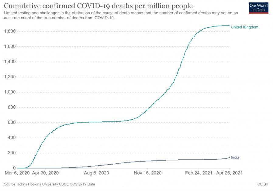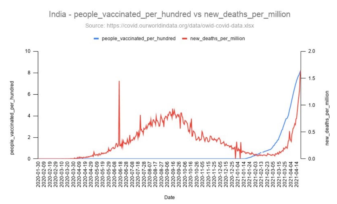 Ob der Zusammenhang zwischen Impfung und dem Anstieg der Todeszahlen in Indien kausal ist? Macht euch eure eigenen Gedanken.