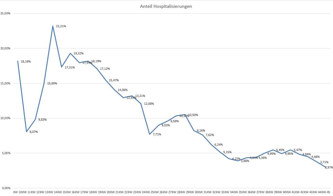 Auch bei dieser Grafik werden Zahlen der Statistik bis rauf in die KW13 abgeändert. Trotzdem zeigt auch diese Grafik einen klaren Trend. Der Anteil der Hospitalisierungen geht immer weiter zurück. Auch hier Anfang September ein kleiner Anstieg, der aber seit Wochen wieder abflacht. Hier sei ebenfalls die Frage gestattet: Wie kann man aus diesen Zahlen eine Überforderung der Krankenhäuser herauslesen?