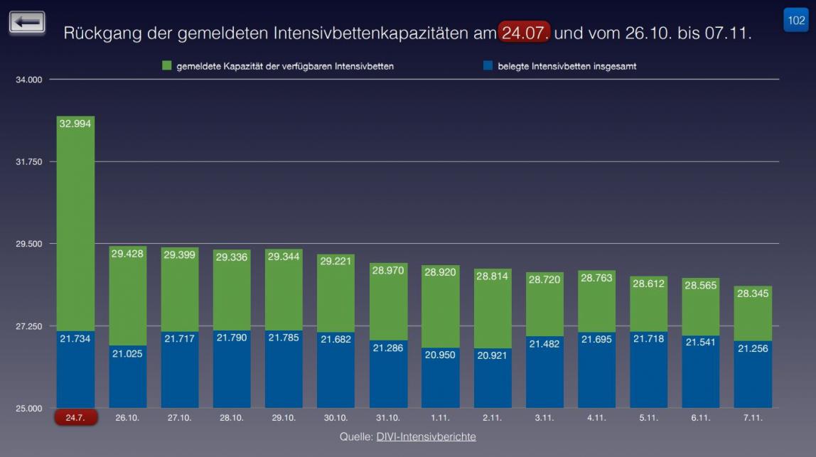 Kommen wir nochmals zurück auf die Zahl der Intensivbettenbelegungen in Deutschland. Man hört immer wieder Berichte von überfüllten Stationen. Ich möchte auch gar nicht leugnen, wenn einzelne Stationen überfüllt sind. Aber das gilt halt nur für Einzelfälle, was immer vorkommen kann und wie bereits bewiesen auch in den letzten Jahren der Fall war. Aber schaut euch doch bitte mal die folgende Grafik an: