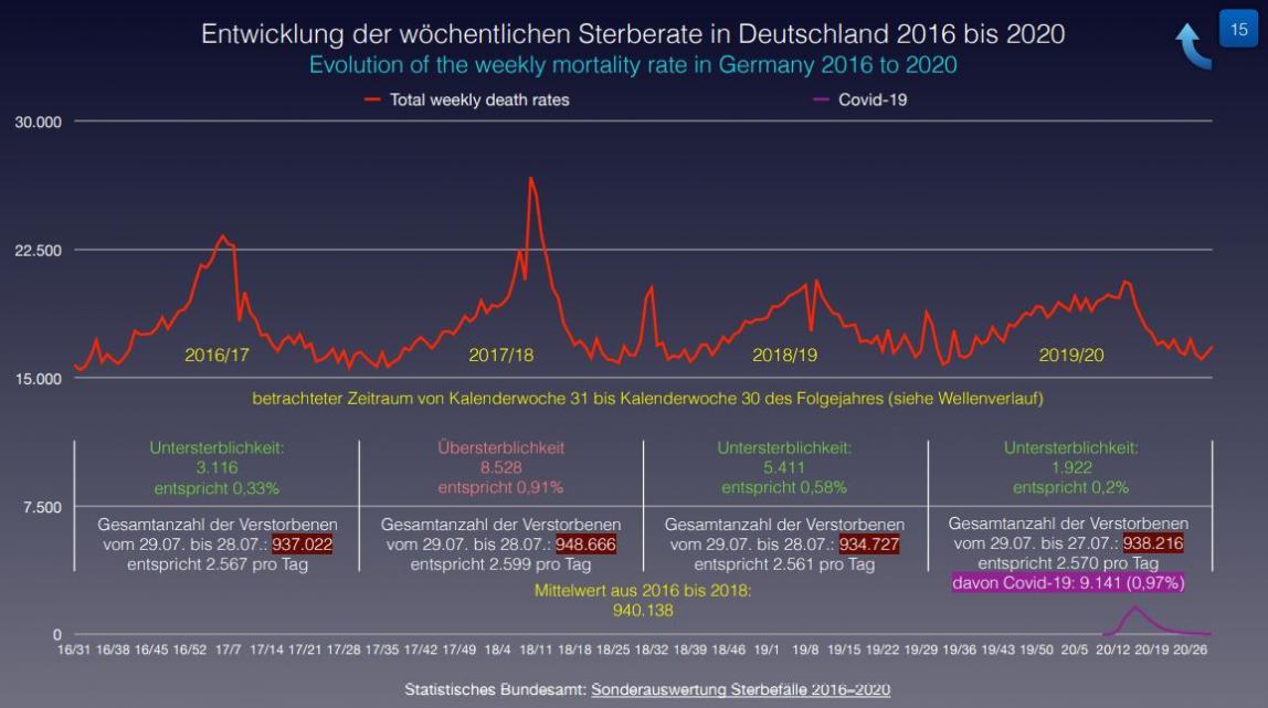 Bitte zeigt mir wo die tödliche Pandemie zu sehen ist. 2020 entpuppt sich als ein durchschnittliches Jahr im Hinblick auf Todeszahlen, Todesraten und Grippeheftigkeit. Natürlich kann man jetzt sagen das waren die Maßnahmen, die haben uns gerettet. Aber dann möchte ich nochmals auf den Anfang des Tages verweisen und den dortigen Berichten. Niemand kennt die Zahl derer, die wegen der Maßnahmen verstorben sind und auch die sind in der Statistik verarbeitet oder werden dies in den kommenden Wochen und Monate.