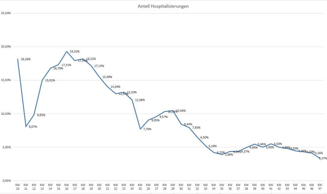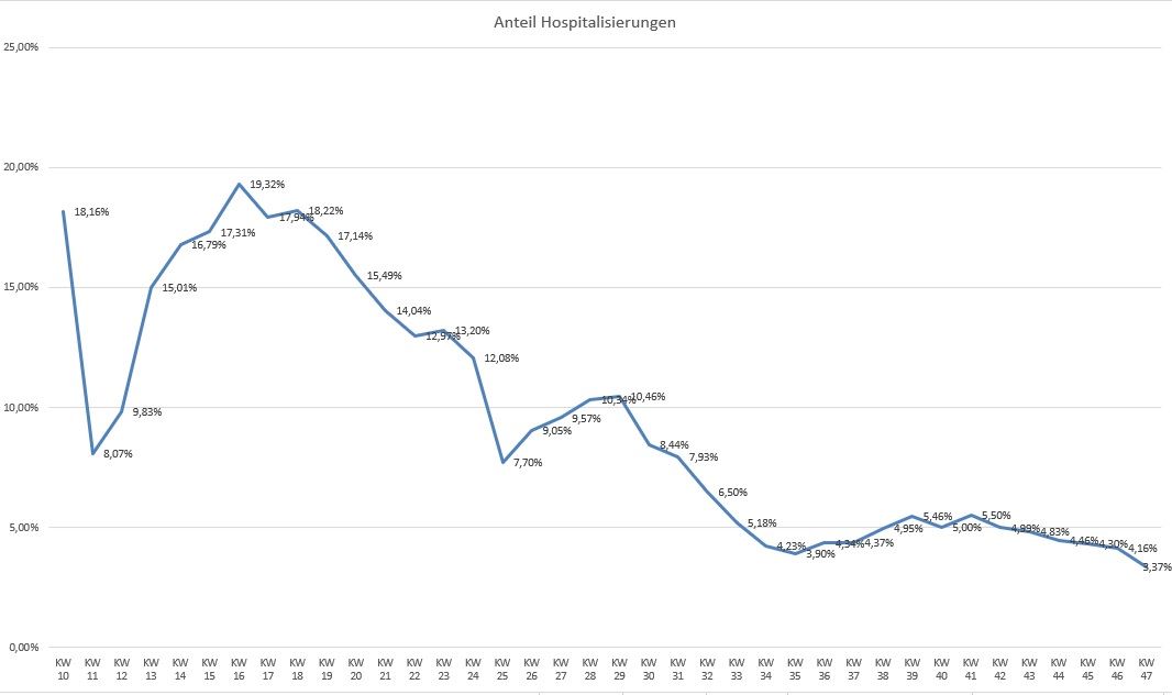 Fakt 2: Der Anteil der Hospitalisierungen geht seit der KW29 von 10.46% zurück auf aktuell 3.37%. Zum Höhepunkt im März/April betrug dieser Wert 19.32 %. Das bedeutet doch nichts anderes, als dass die Immunität innerhalb der Bevölkerung schon sehr weit fortgeschritten ist, aber das interpretiert jeder anders.