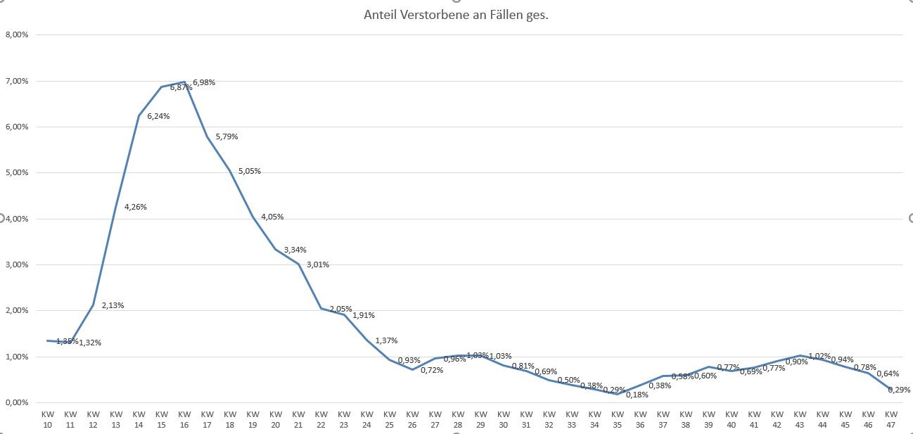 Fakt 1: Weniger als 1% der registrierten Fälle stirbt an Covid-19. Da man mit einer ca. 10-fachen Dunkelziffer rechnet, sind auch hier wieder die Sterblichkeitsraten eines Dr. Ioannidis bestätigt. Selbst wenn man nur mit einer 5-fachen Dunkelziffer rechnen würde. Im Übrigen pendelt sich diese Rate bereits seit der KW25 in diesen Sphären ein. Ich erinnere daran, es handelt sich dabei um die offiziellen RKI-Daten.