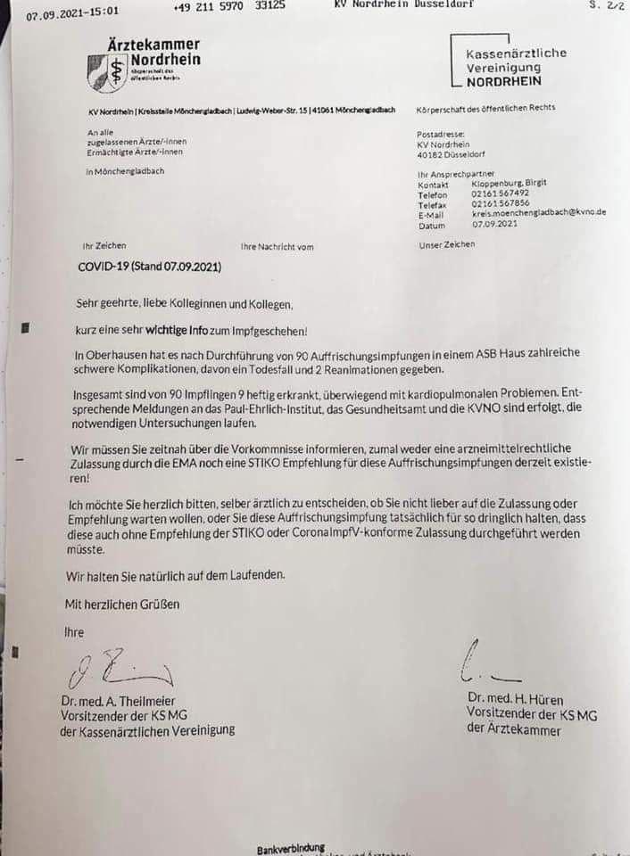 Seht euch mal den folgenden Brief der Ärztekammer Nordrhein vom 07.09.2021 an: