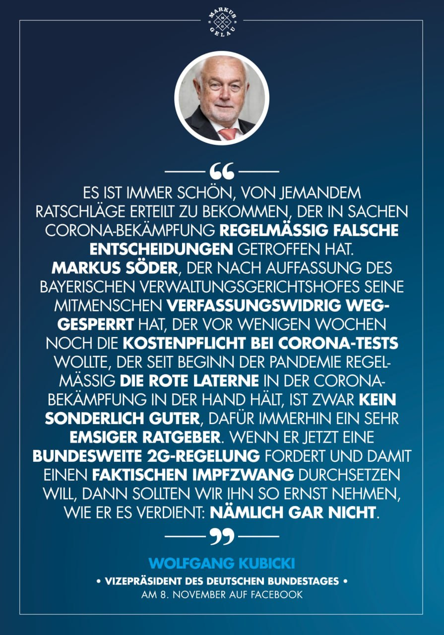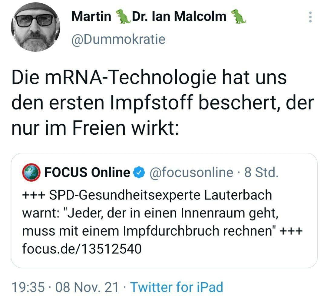 „Gesunde Menschen müssen nachweisen gesund zu sein, während kranke Geimpfte frei rumlaufen dürfen, oder habe ich da etwas falsch verstanden. Verstehen kann ich diese Impfapartheid nicht, geschweige denn akzeptieren, auch wenn ich selbst geimpft bin, allerdings aus anderen Gründen“