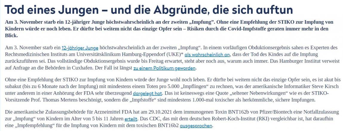 Nicht jeder der die Impfung kritisch sieht ist gleich ein Verschwörungstheoretiker. Am 03.11.2021 starb ein 12-jähriger Junge höchstwahrscheinlich an der zweiten Impfung. Nach diesem Fall konnten auch die Mainstream-Medien nicht mehr so einfach wegschauen. Eine erste „vorläufige“ Obduktion hat ergeben, dass der Junge mit höchster Wahrscheinlichkeit an den Folgen der Impfung verstorben ist. Wäre es nicht jetzt an der Zeit innezuhalten und zu prüfen, was wirklich notwendig ist und was eben nicht.