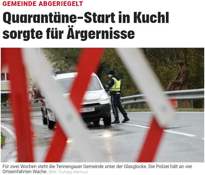 Eine weitere Meldung kommt aus Österreich. Dort wurde der idylische Ort Kuchl für zwei Wochen abgeriegelt. Die Zeitungen versuchen das durchaus als - ist ja nicht so schlimm - abzutun. Es gibt natürlich auch leicht kritische Töne: