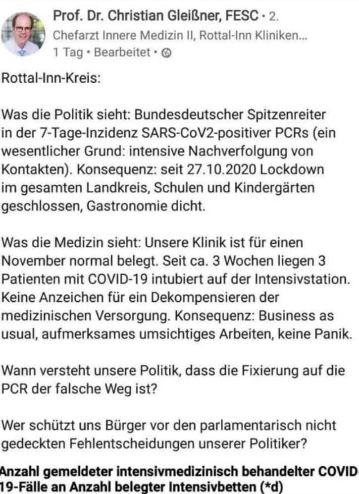 Es gebe viel über den Test zu sagen, aber im Grunde ist alles gesagt und die Fakten sprechen für sich. Der PCR-Test ist wie würfeln. Letztes Beispiel stammt aus Augsburg. Dort waren 58 von 60 Tests fehlerhaft. Und wer glaubt, dass ist doch nur ein Einzelfall, der irrt. Gleiches passiert seit Monaten, wird nur nicht an die große Glocke gehängt. Bereits im April gab es solche Vorfälle. Die, wenn man einmal genau drüber nachdenkt, ja auch logisch sind. Noch nie in der Geschichte gab es ein solches Testaufkommen. Die Labore arbeiten am Limit und müssen ihre Kapazität immer weiter ausbauen. Jeder der in der Produktion tätig ist, weiß was das heißt. Der kurzfristige starke Kapazitätsausbau geht immer auf Kosten der Qualität. Das sind kausale Zusammenhänge die sich nicht wegdiskutieren lassen.
