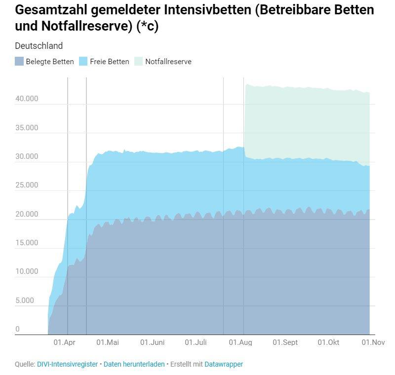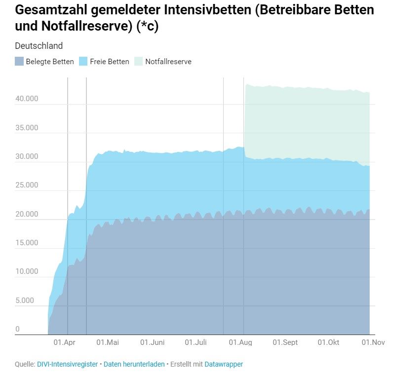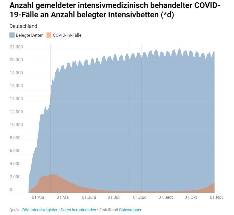 Jetzt wird der ein oder andere sagen, aber was ist dann mit den Intensivstationen. Dort steigen ja die COVID-19 Fälle und v.a. wird der Lockdown auch mit der möglichen Überlastung der Intensivstationen in der nahen Zukunft begründet. Man sähe ja, wie die Bettenbelegungen in den letzten Wochen gestiegen sind. Die Ministerpräsidenten-innen haben sich sogar darauf verstiegen zu argumentieren, die Anzahl der belegten Intensivbetten hat sich in den letzten 8 Tagen verdoppelt. Gehe dies so weiter, wären wir spätestens Ende November an der Kapazitätsgrenze.