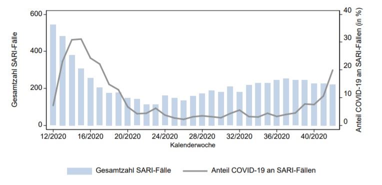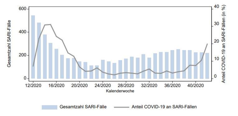 Die Zahl der SARI-Fälle befand sich in der 42. KW 2020 insgesamt auf einem