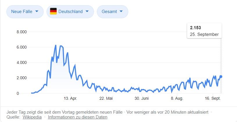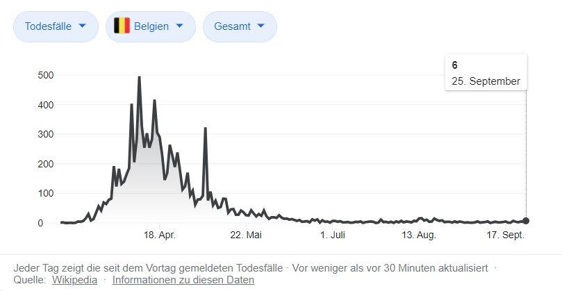 Komisch es stirbt niemand an Covid 19 mehr oder sagen wir besser so gut wie niemand. Ich schreibe es gerne nochmals, natürlich ist jeder Verlust ein Verlust. Aber sind die Maßnahmen die in ganz Europa wieder eingeführt werden und auf den 2. Lockdown hinzielen, wirklich deswegen gerechtfertigt. Das kann doch wirklich keiner ernsthaft annehmen.