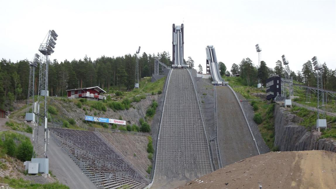 Eine kurze Besichtigung der Kupferminen stand aber für später erst an. Zunächst fuhren wir in Richtung des Sportzentrums der Stadt. Wobei Stadt vielleicht ein großes Wort ist. Falun zählt ca. 37.000 Einwohner. Immerhin. Bekannt ist Falun aber v.a als Sportstadt. Falun ist das Zentrum für nationale und internationale Wintersportwettkämpfe. So befindet sich in Falun der Sitz des Schwedischen Skiverbands sowie das Sport- und Freizeitareal Lugnet, in dem neben den Lugnet-Schanzen auch ausgedehnte Skilanglaufloipen und Abfahrtspisten liegen. Auf den Schanzen fanden bis 2002 Wettbewerbe im Skisprung-Continental-Cup und im Weltcup der Nordischen Kombination statt. Seit 2002 ist Falun jedoch nur noch Austragungsort für den FIS Cup und Skisprung-Continental-Cup sowie für Weltcuprennen im Skilanglauf.