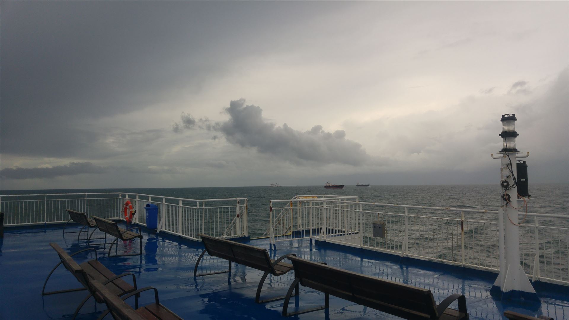Kurz und gut, sie hat. Es wackelte wirklich ziemlich, zumindest für eine Landratte wie ich es eine bin. Zum Übel werden war es nicht genug, aber geradeaus gehen war unmöglich. Solange man saß und auf das Meer schaute war alles gut. Solange schmeckte auch der Kaffee und die Croissants. Nach ca. einer Stunde gingen wir dann an Deck und wagten uns in den Sturm hinein.