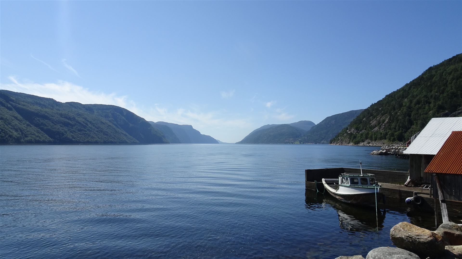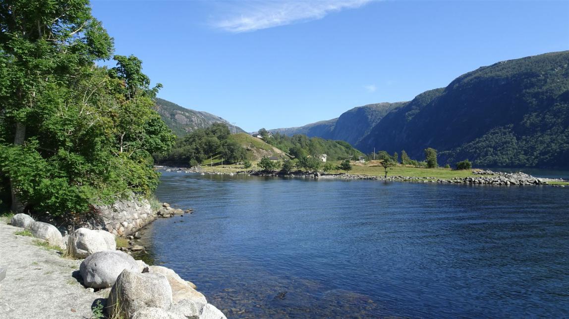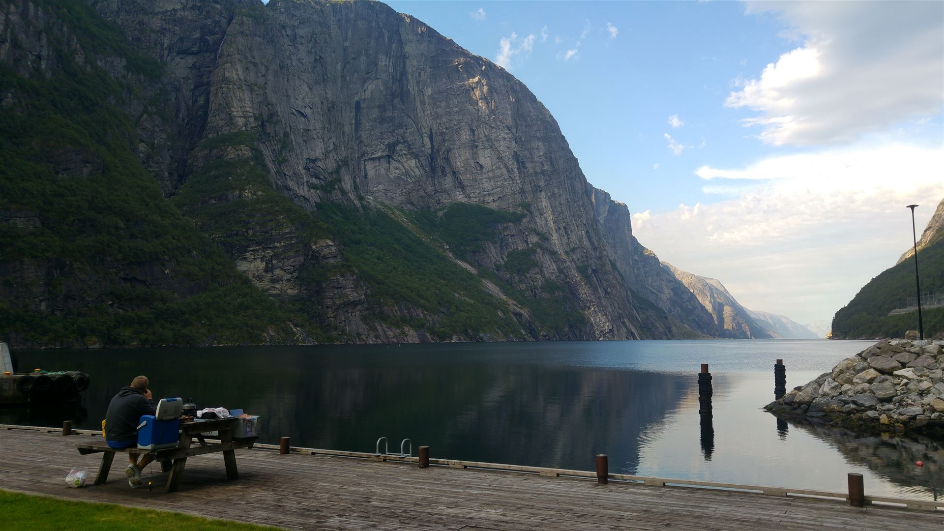 Auf der linken Seite des Fjords, irgendwo da vorne an den Felsen, befindet sich der Kjerag. Damit ihr wisst von was ich spreche, ein Büldchen für euch.