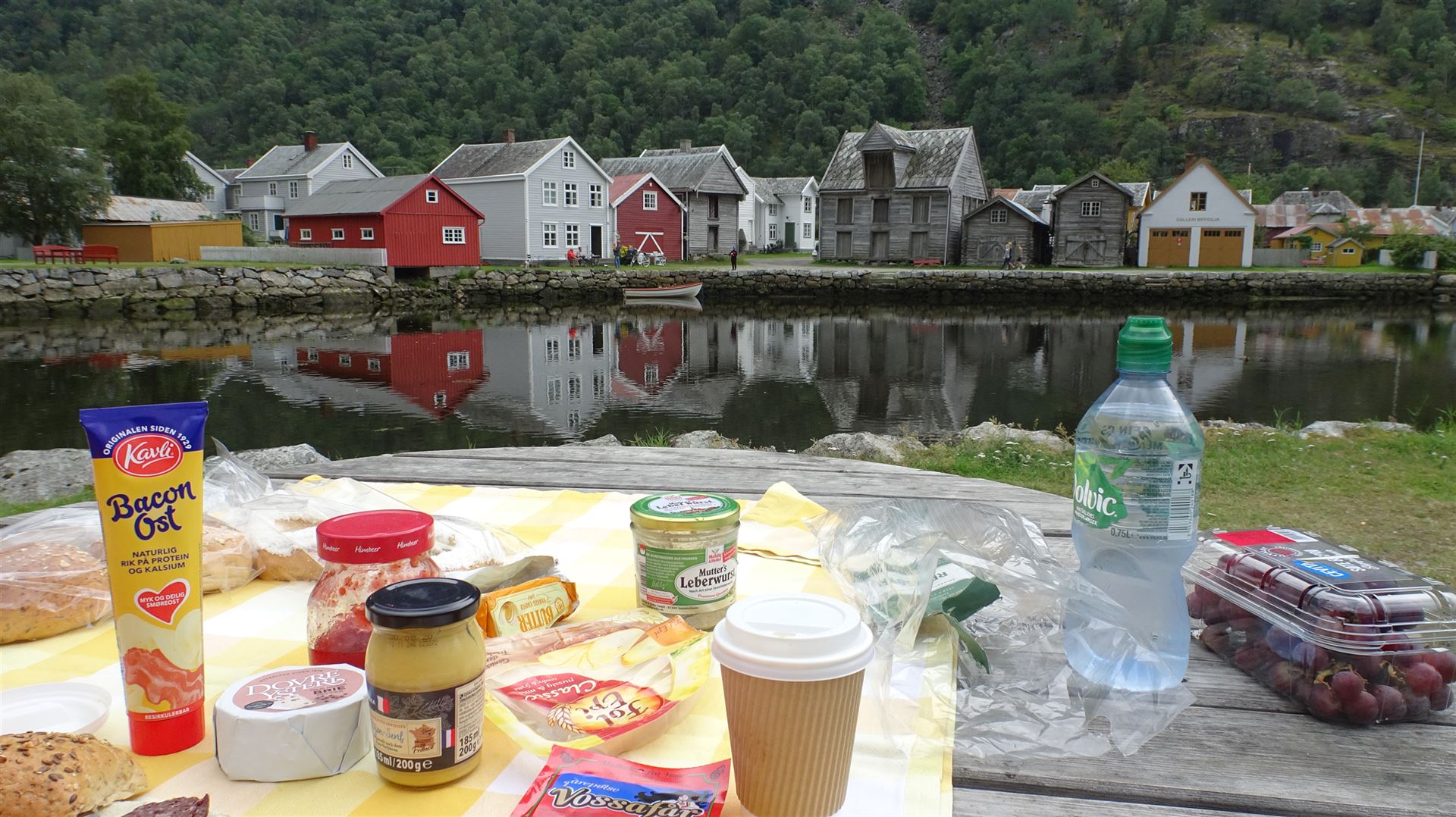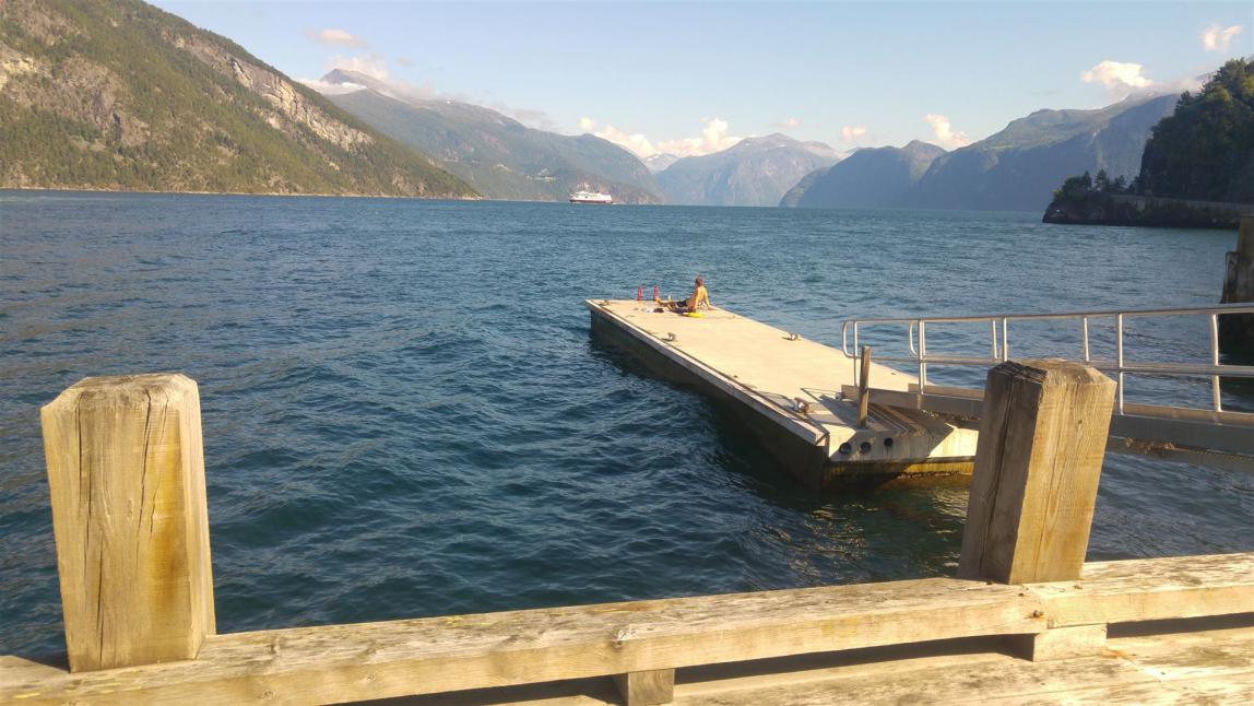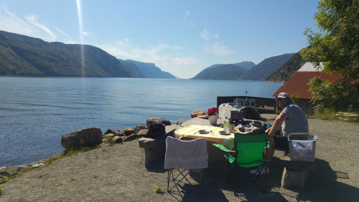 Dieser Platz hat gleich mehrere Bedingungen erfüllt. Zunächst einmal war die Aussicht auf den Fjord genial, dann gab es Tische und es gab die Möglichkeit zum Baden. Was wir dann hier auch gemacht haben. Genial. Obwohl der Platz eigentlich sich im Ort direkt befindet, ist er ruhig gelegen und für eine Pause geradezu prädestiniert. Besser geht es im Grund nicht.