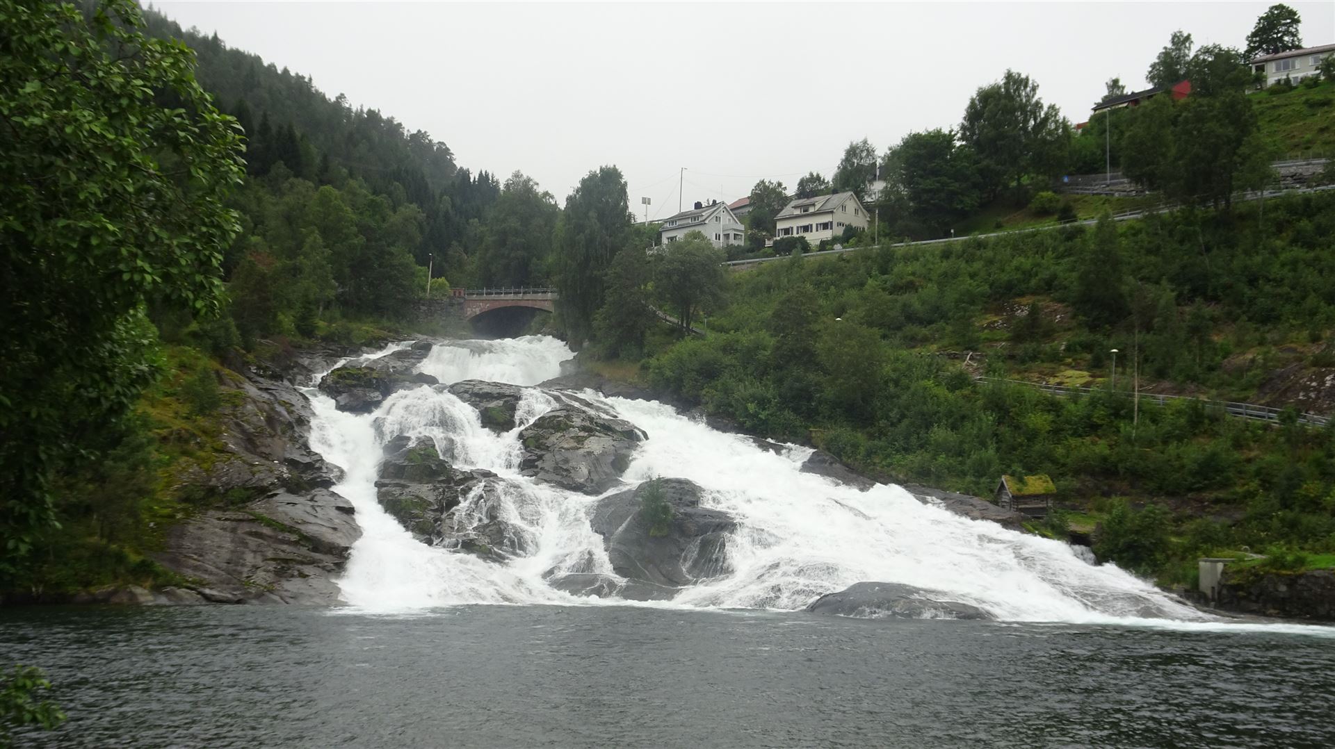 Ein recht fotogener Wasserfall fällt oder in diesem Fall rutscht, am Anleger herunter. Übrigens die Fahrt auf dem Geirangerfjord kann man wirklich empfehlen. Mit Auto kostete die Fähre insgesamt ca. 60 EUR. Aber dafür hat man das Erlebnis wie z.B.