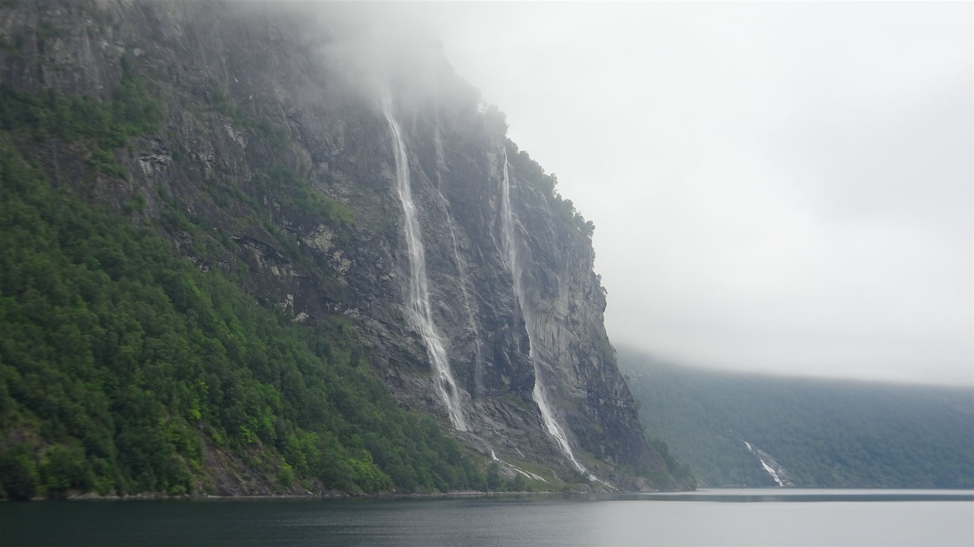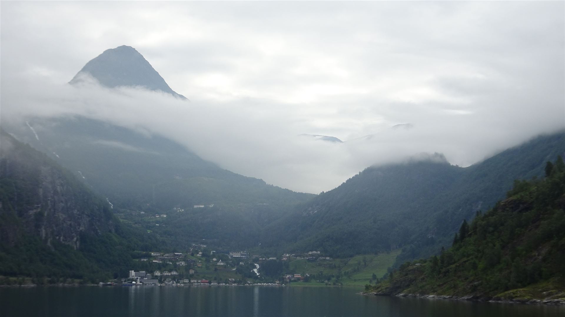 den Blick auf Geirang vom Wasser aus. Das haben sonst ja nur die Kreuzfahrer. Wie ihr seht, war allerdings am Morgen der Nebel noch schwer über den Bergen gehangen. Das hat sich dann im Laufe des Vormittags aber geändert und die Sonne brach wieder durch. Machte im ganzen aber nichts und die Fahrt hatte sich, ich wiederhole mich, bekomme ich eigentlich Geld dafür, gelohnt.