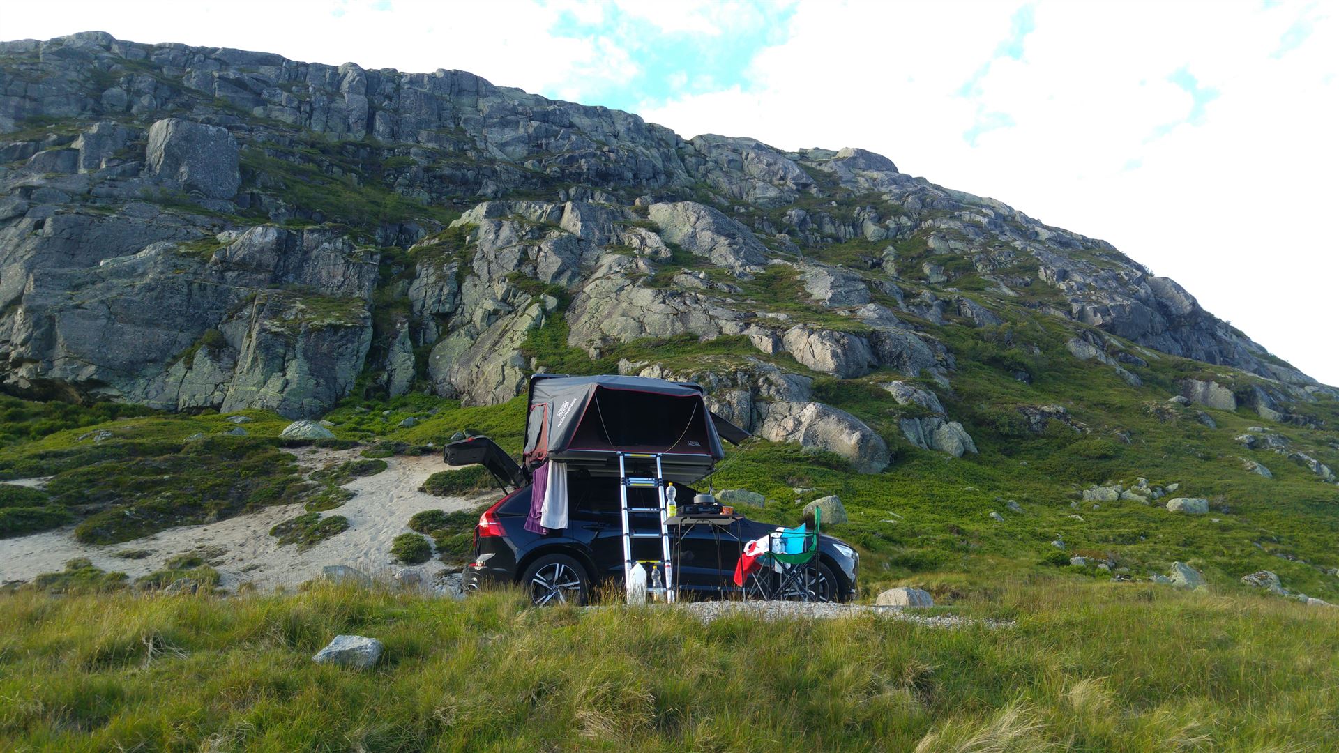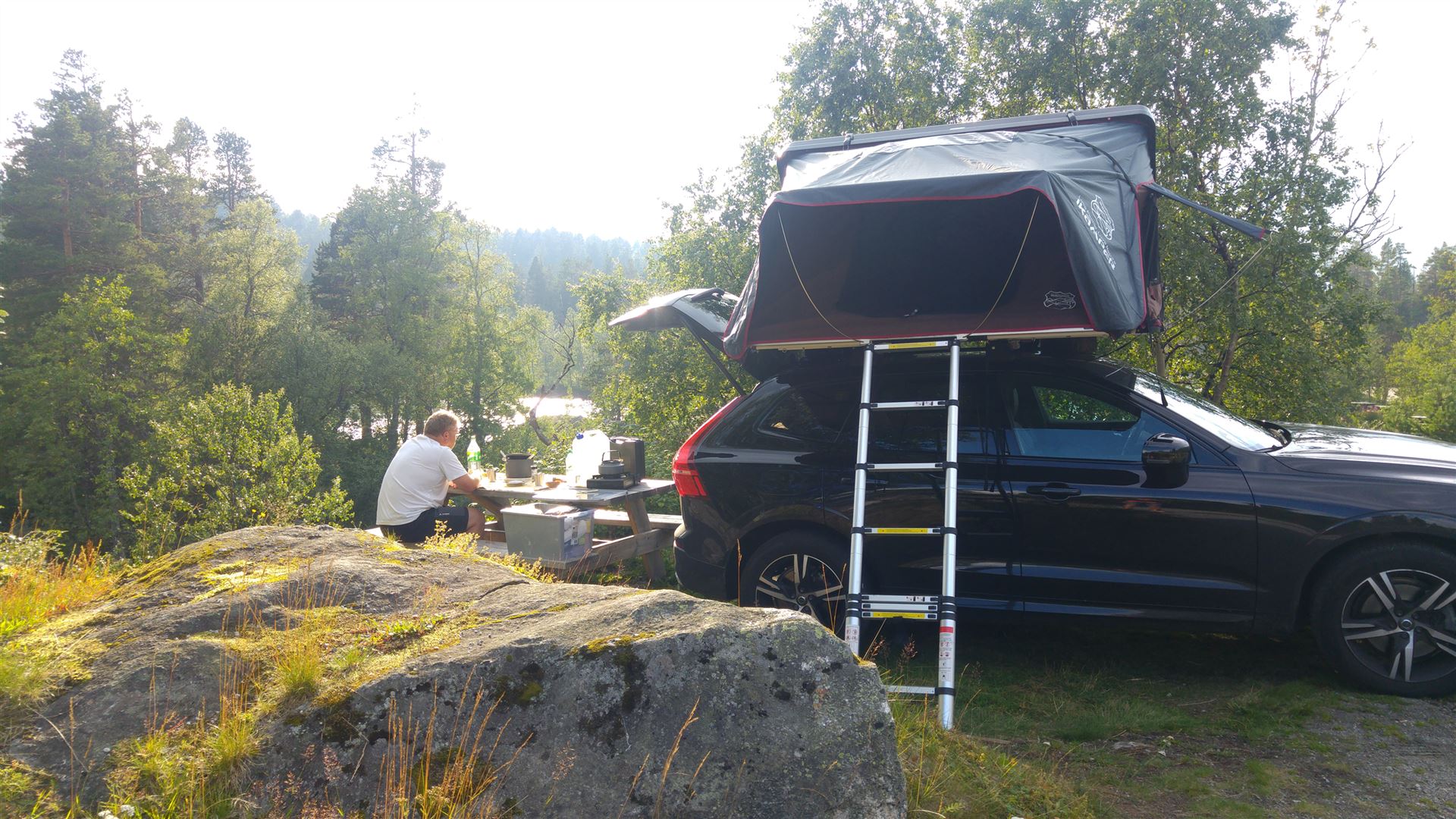 An den Bildern ist unschwer zu erkennen, am Morgen zieht man gerne ein Jäckchen an, in diesem Falle ein Hoody. Neben uns hatte sich auf der einen Seite noch eine norwegische Familie mit ihren Zelten gesellt. Sie mussten allerdings erst gekommen sein, als wir schon in unserem gemütlichen Dachzelt schliefen. Wir hatten davon nichts mitbekommen. Auf der anderen Seite stand ein deutscher VW Caddy, indem ein Ehepaar nächtigte. Der VW Caddy war ihr Wohnmobil. Was wieder einmal zeigte, man muss nicht unendlich viel Geld ausgeben um Campen zu fahren und schon gar nicht um auf Komfort zu verzichten.