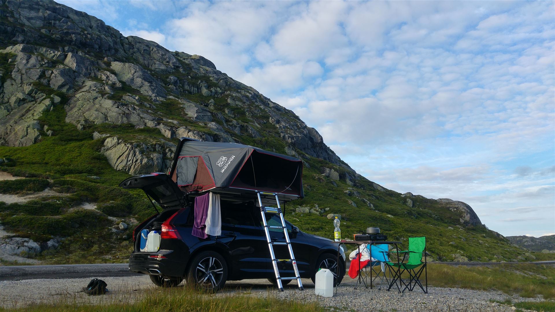 Leider hingen am Abend als wir ankamen die Wolken bzw. der Nebel schwer über den Bergen. Die Straße, an der wir unser Nachtlager aufschlugen, ist im übrigen nur eine Nebenstraße und sehr wenig befahren. Ein Sprung in den Fjord gab es auch nicht, den der war tief unterhalb der Straße. Aber am Morgen beim Aufwachen zeigte sich die komplette Schönheit des Platzes. Was für ein Panorama. Dass wir genau gegenüber des Preikestolen standen, war uns zwar natürlich schon klar, aber erst als wir auf dem Preikestolen standen wurde uns klar, wie nah wir die Nacht an diesem Wahrzeichen der Norweger verbrachten. Am Ende der Straße befindet sich noch ein weiterer größerer Parkplatz auf dem man übernachten kann. Allerdings wenn man zu spät dran ist, gibt es dort oben dann doch Platzprobleme. Weswegen dieser Platz hier eine hervorragende Alternative war.