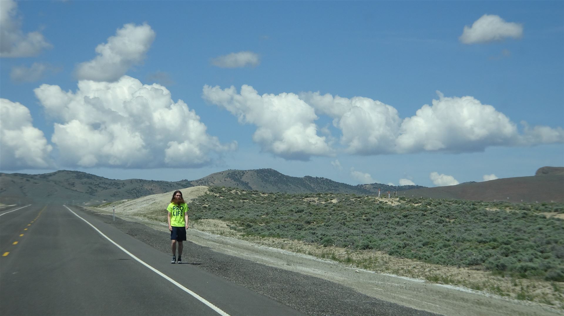 Das härteste an diesem Foto ist vielleicht das Wissen, beim Wanderer war weder vor noch hinter ihm ein Versorgungsfahrzeug. Er hatte auch keinen Rucksack bei sich. Er sah aber nicht Hilfe suchend aus. Er hat uns zugelächelt als wir vorbei gefahren sind und uns gegrüßt. Auf seinem T-Shirt stand "Pro-Life". Ich habe etwas recherchiert und heraus gefunden es handelt sich bei Pro-Life um eine Organisation die sich gegen Abtreibungen ausspricht. Sie wollen Abtreibungen verhindern, aber soweit ich das beurteilen kann nicht durch Verbote sondern durch Beratung und Hilfestellung z.B. auch in Bezug auf Adoptionen. Also keine ganz schlechte Sache.