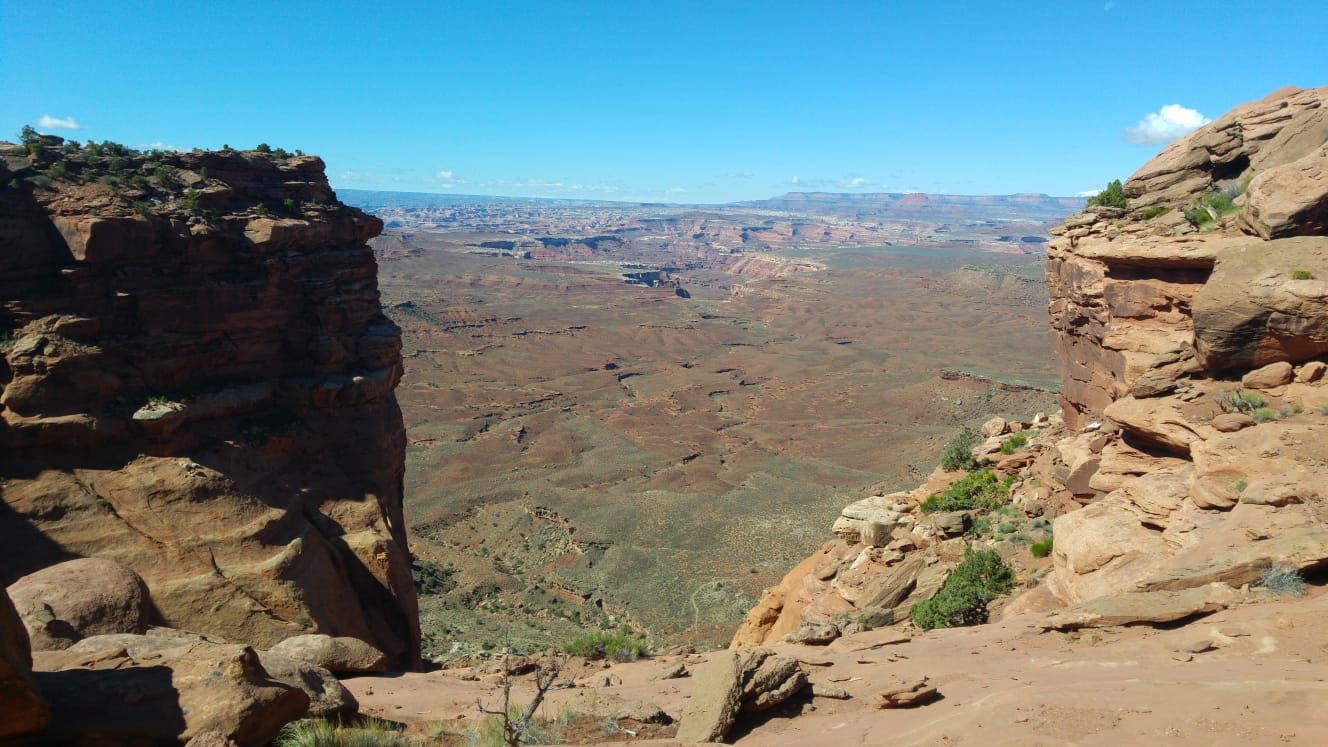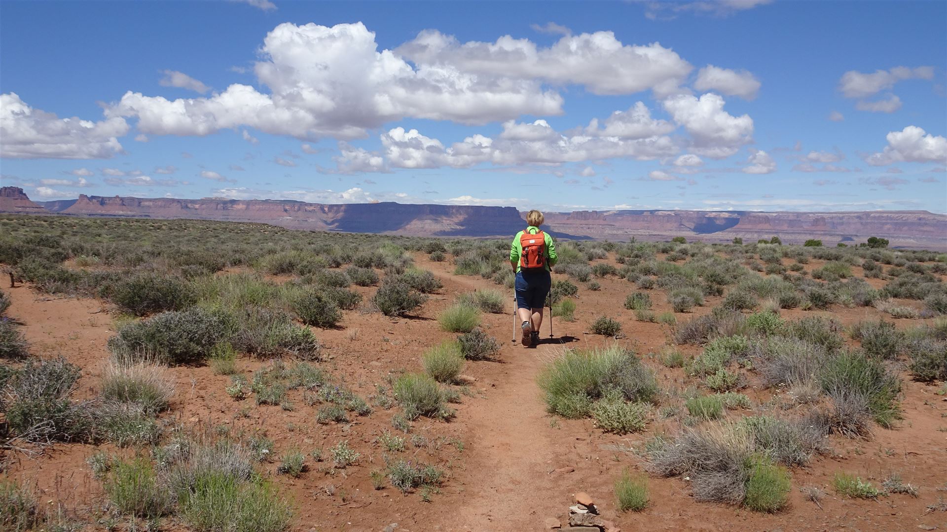 Der Murphy Trail geht erst einmal 1.5 Kilometer über die Hochebene bis zur Abbruchkante in Richtung Green River. Dann fällt der Trail steil hinunter. Man glaubt erst gar nicht ein Weg könnte in die Tief führen, aber keine Angst der Weg ist auch mit Höhenangst gut zu bewältigen. Über eine Geröllhalde steigt man auf einem gut instandgehaltenen Trail immer weiter in die Tiefe und bald erreicht man die erste Ebene. Auf der geht es den sogenannten Hogback Trail in Richtung White Rim Trail. Nach gut 7.7 Kilometer erreicht man ihn dann. Man steht mitten drin im Canyonlands und fühlt sich fast ein wenig verloren.