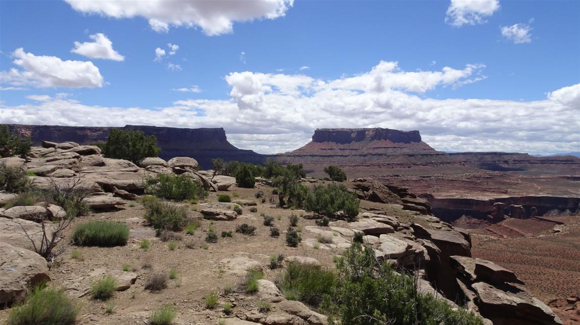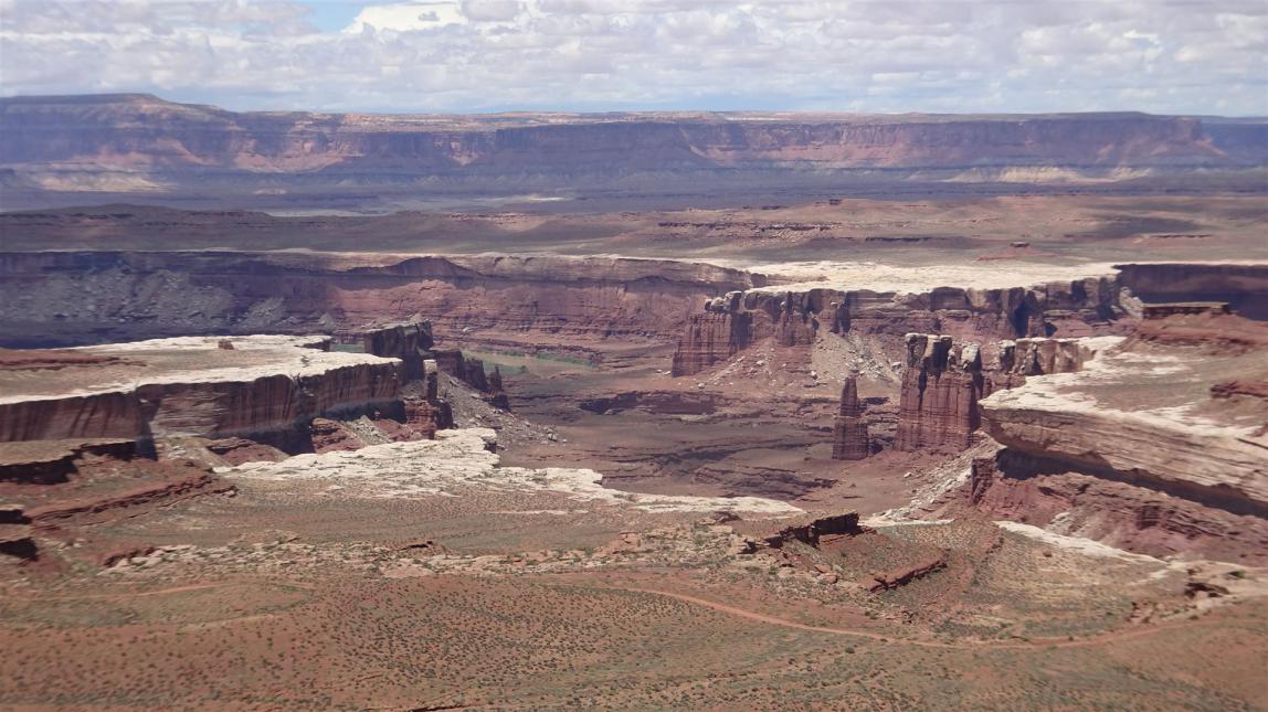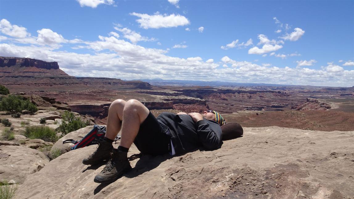Da Memorial Weekend ist, war der White Rim Trail auch ziemlich befahren. Während unser vielleicht 45 Minuten Pause kamen ca. 2 Autos vorbei gefahren. Die Fahrer winkten uns zu, offensichtlich überrascht hier unten Fußgängern zu begegnen. Es hätte gerade noch gefehlt sie hätten uns gefragt ob sie uns mitnehmen können. Eventuell hätte ich Ja gesagt, denn inzwischen war die Sonne mit Kraft versehen und brannte auf unsere nicht gerade sonnenverwöhnte Haut.