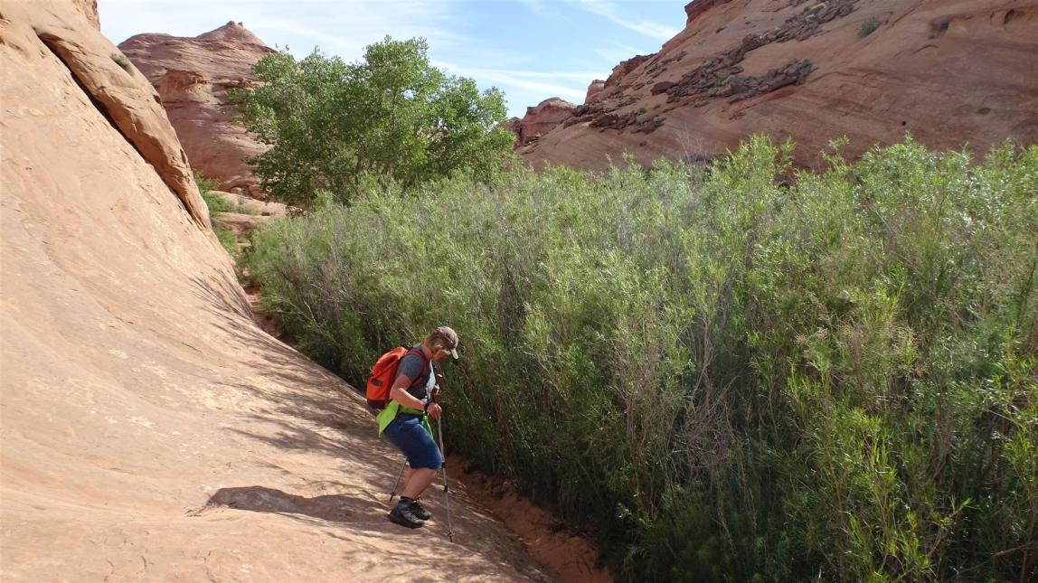 Wir zogen los und fanden zunächst den Weg auch sehr gut. Allerdings haben wir uns irgendwo zwischen den Wegpunkten verloren und standen an einer Abbruchkante, an der es kein Abstieg gab. Blöderweise passierte mir just in diesem Moment auch noch ein Missgeschick. Ich rutschte auf einer Steinplatte aus und ries mir dabei die Wade am spitzen Stein auf. Ich könnte jetzt schreiben, das Blut floss in Strömen. Immerhin floss es. Mit Blick auf den Arsenic Arch tauften wir diese Wanderung "Arsenic View Point Hike".
