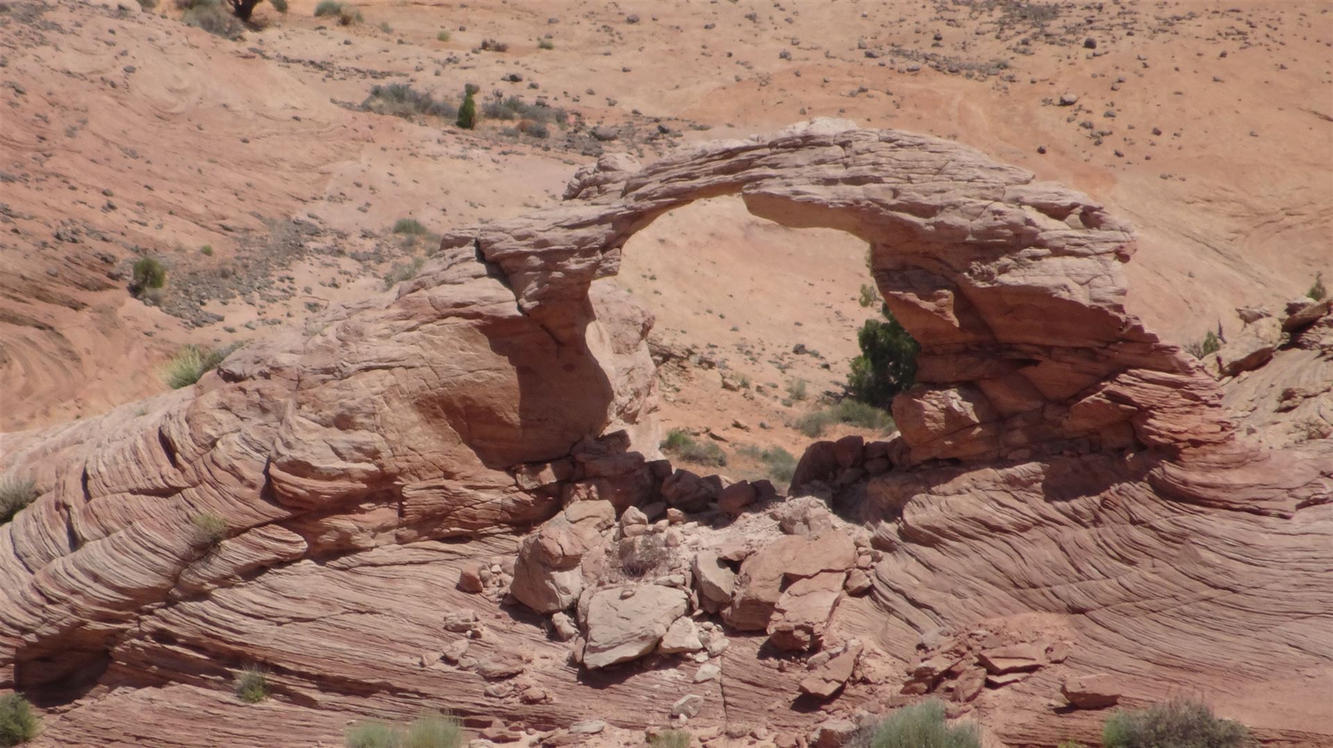Die Bilder zeigen natürlich nur ein paar Ausschnitte der Dinge die man hier sehen kann. Aber wir hatten heute noch mehr vor. Nächster Haltepunkt war der Trailhead zum Arsenic Arch. Den Arsenic Arch habe ich wieder mal Fritz Zehrer´s Internetseite abgeluchst und natürlich habe ich mir auch die Wegpunkte fein säuberlich in mein GPS-Gerät importiert. Gleich gegenüber der Einfahrt zum kleinen Ägypten geht es auf der anderen Seite in eine Dirtroad. Dieser ca. 5 Meilen folgen, dann kommt man an die Stelle von der man loslaufen sollte. Hier trafen wir auch unsere deutschen Wanderer aus dem Leprechaun Canyon. Sie kamen gerade vom Arch zurück und wollten jetzt anschließend die Steinformationen anschauen. Jetzt hatten wir auch wie erwähnt alle etwas Muße uns über die USA, das Wandern, das Gravelroadfahren und sonstiges auszutauschen. Die beiden hatten übrigens bei Rough Roads in Salt Lake City ihr Auto gemietet. Beim Namen bin ich mir nicht ganz sicher. Werde wohl noch recherchieren müssen deswegen. Auf jeden Fall kann man dort 4x4 Autos mieten, mit denen man auch Offroad fahren darf. Außerdem bekommt man garantiert das Auto und die Marke die man auch reserviert hat. Ich habe davon zwar schon mal gehört, aber die Adresse jetzt leider nicht parat. Ich werde diese im Nachhinein noch liefern. Versprochen!