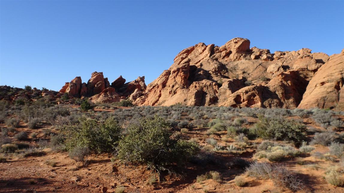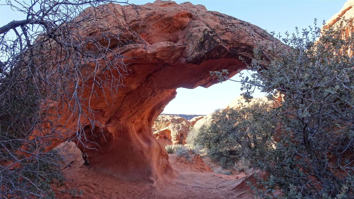 Für unterwegs hatte ich mir zwei Besichtigungspunkte ausgesucht. Der erste war der Pentagon Arch, dessen Trailhead nur ca. 30 min. von St. George aus zu erreichen ist. Man fährt die I15 in Richtung Norden und verlässt diese wieder bei der Ausfahrt Leeds. Dann durch den Ort durch und kurz dahinter nach rechts in Richtung Sand Cove Campingplatz. Es warten ca. 3 Meilen Dirtroad auf uns. Nichts wirklich dramatisches und nichts was nicht durch langsames Fahren gemeistert werden könnte. Am Sand Cove Trailhead ließen wir dann das Fahrzeug stehen und gingen den Rest zu Fuß.