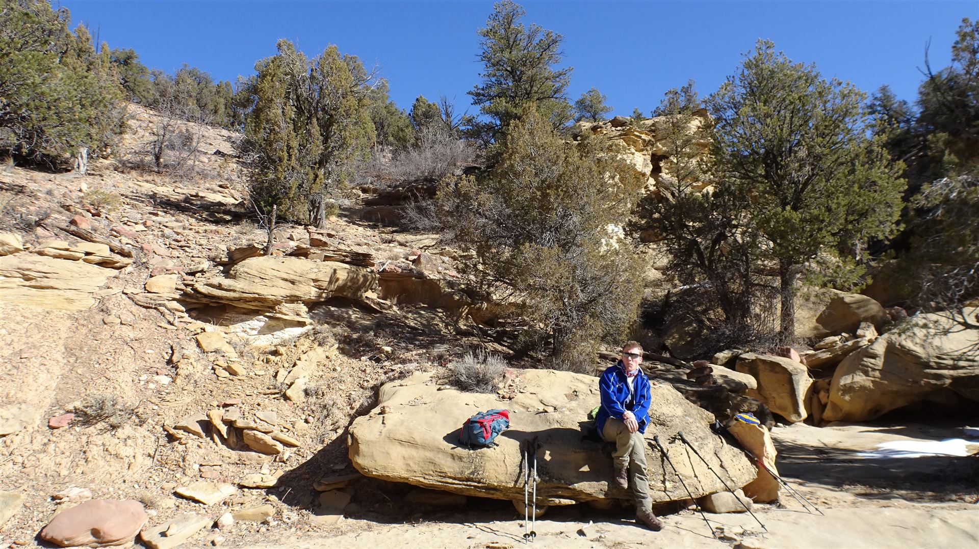 Es war eiskalt als wir den Trailhead erreichten. Die Wasserpfützen waren noch alle zugefroren. Einen offiziellen Trailhead gibt es übrigens nicht. Man stellt sein Fahrzeug seitlich im Coal Bed Canyon ab und hofft inbrünstig, es möge doch bitte bei der Rückkehr noch da stehen. Was es sicher auch tun wird, außer eine Flashflood würde durch den Canyon schieben. Dann allerdings hast du eh andere Probleme als das Mietauto. Keine Angst, eine Flashflood war heute nicht zu erwarten. Es war strahlend blauer Himmel und in keine Richtung standen Regenwolken am Himmel.